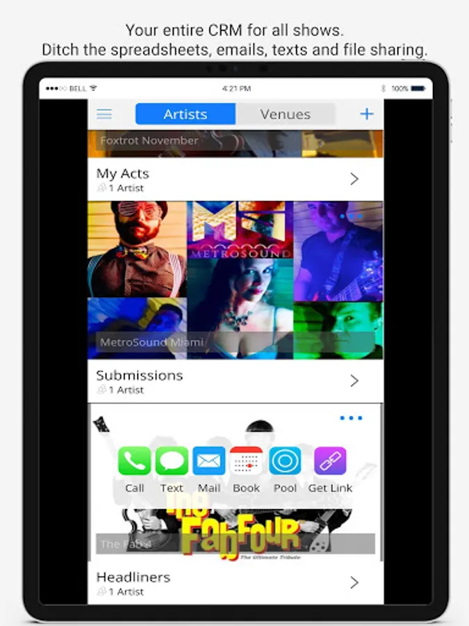 - Create tickets in 30 seconds and link them to your booked shows for enhanced reporting and tracking of all gigs.
