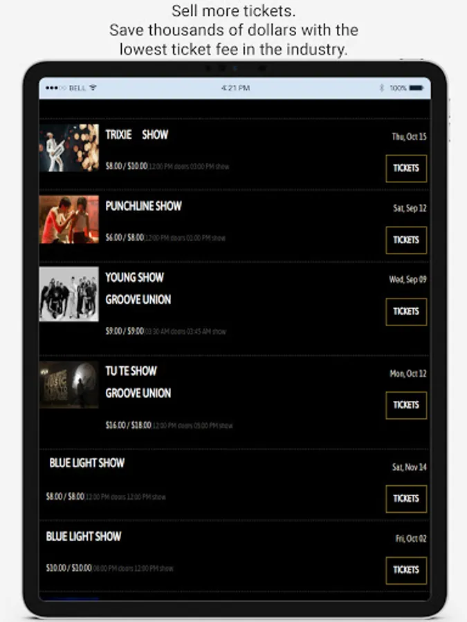 ShowSlinger is a powerful, simple app allowing venues and event organizers to sell tickets and book gigs. With the lowest ticketing fees in the industry, you’ll save thousands every year!