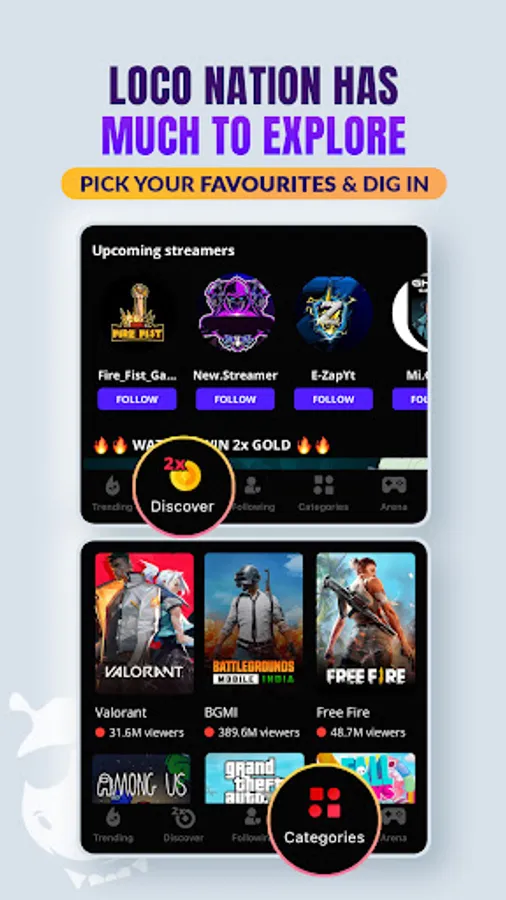On Loco, you can watch best upcoming and top gamers playing top games live. You can follow, support, and engage with them. You can also become a streamer on Loco and live stream games to build your own gaming community.