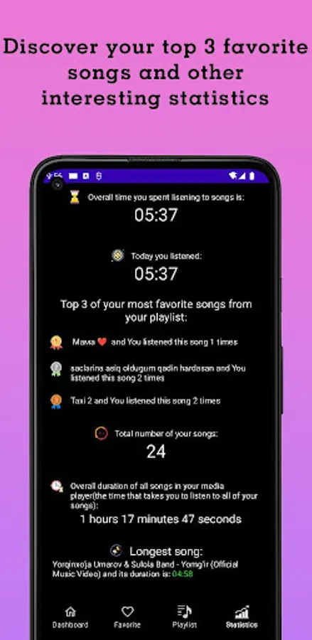 Discover your music in a whole new way with our mp3 player. Our innovative technology analyzes your music library to provide you with personalized data such as your top 3 songs and how long you've spent listening to music overall and today. You can also view stats about your music such as the longest and shortest songs and the biggest file size. Explore your music like never before with our music player.
