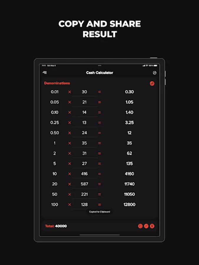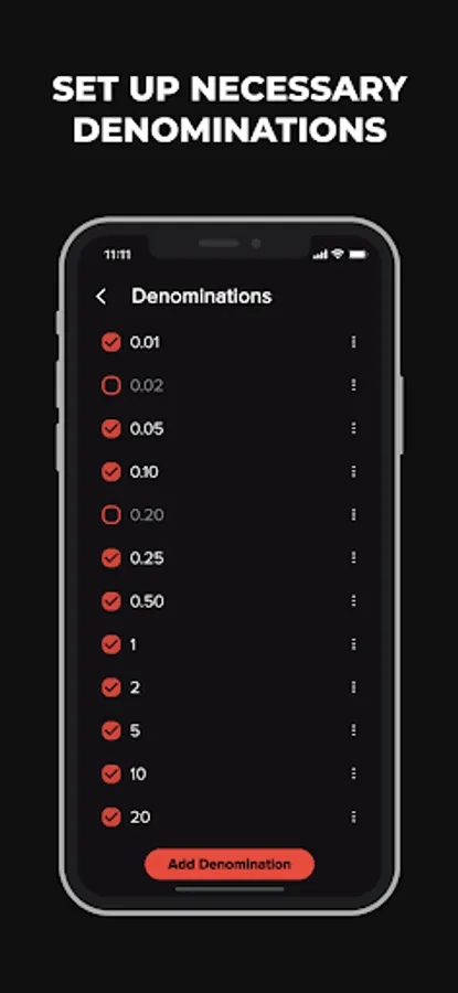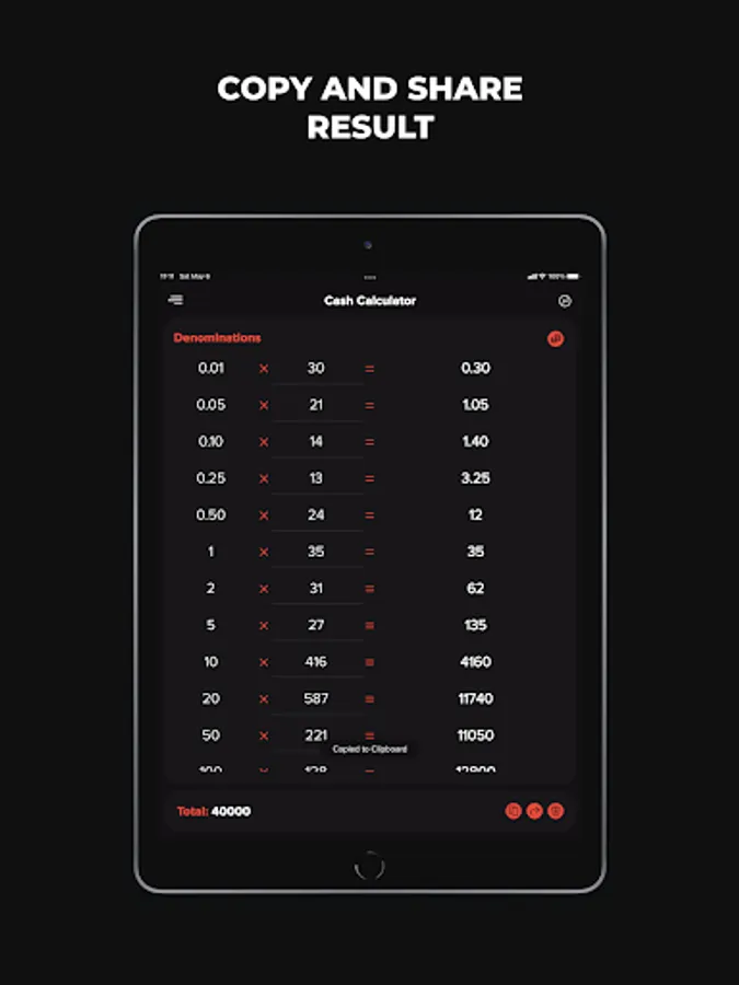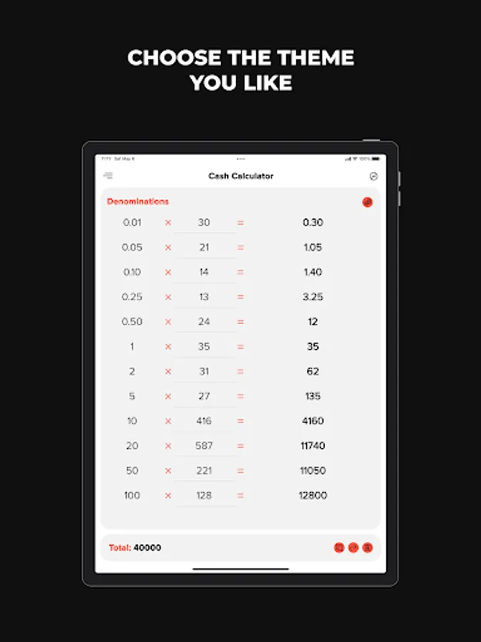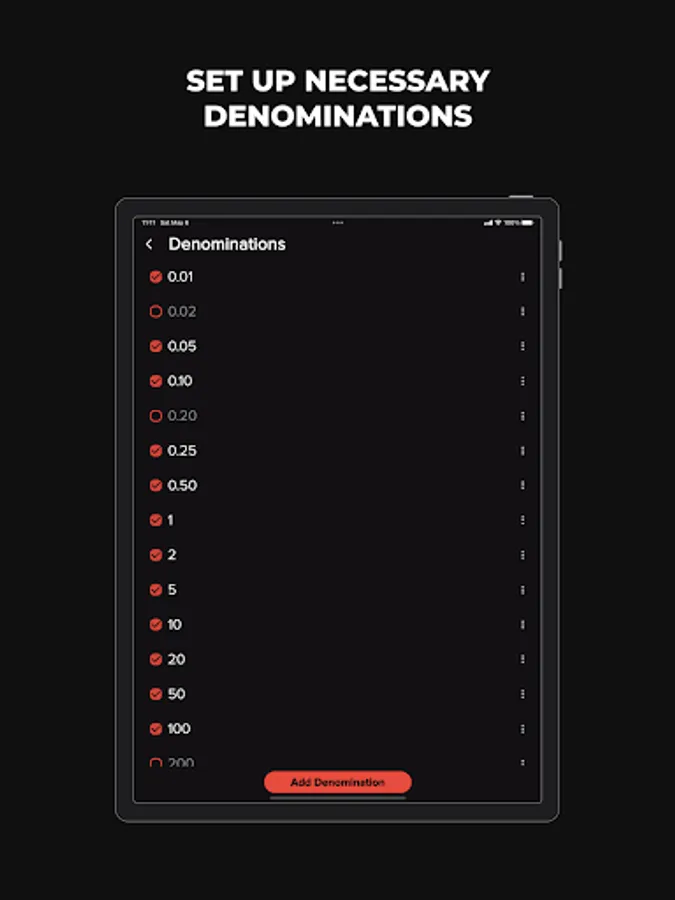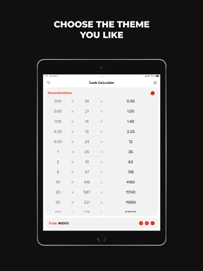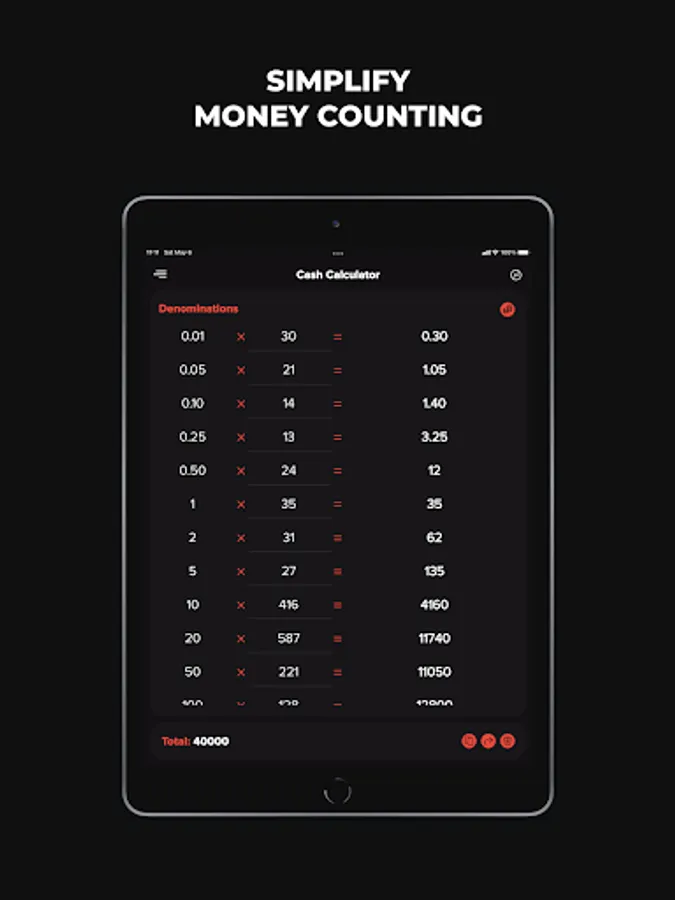 Perfect for every individual and business, this tool that adapts to all countries and currencies, making it a truly global Cash Counting App. Plus, its flexible denominations setting offers customized counts based on your specific needs.