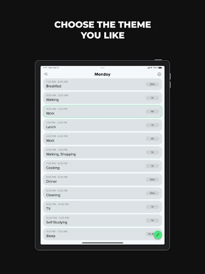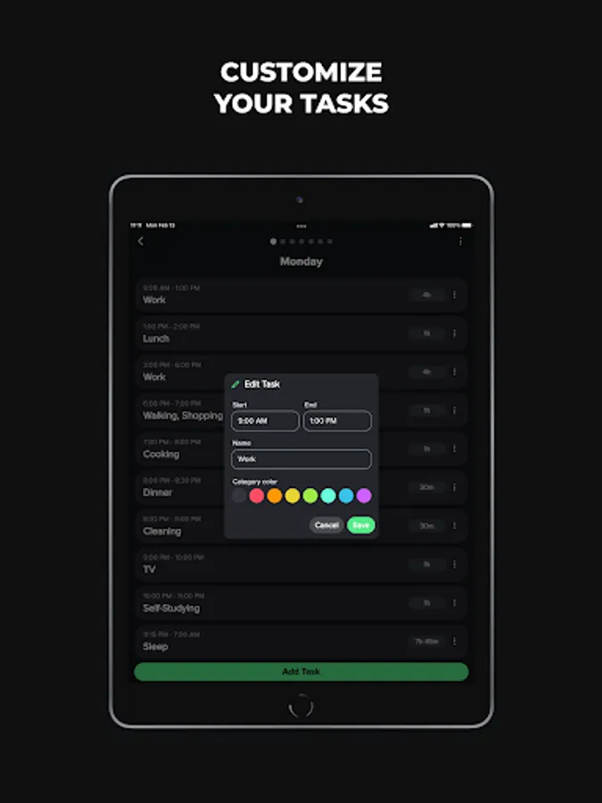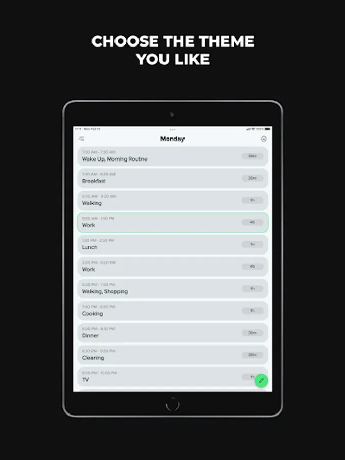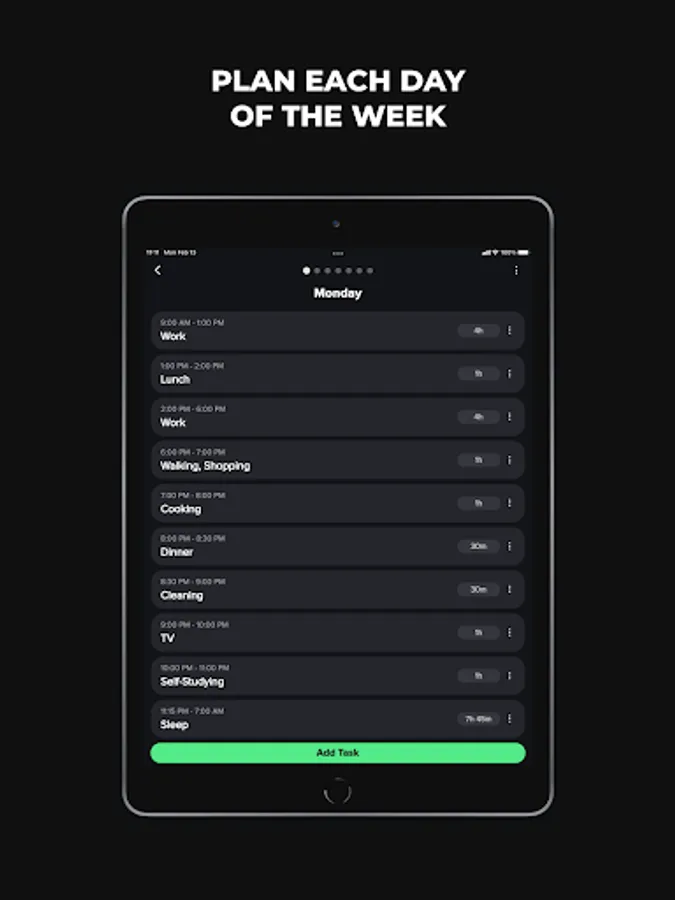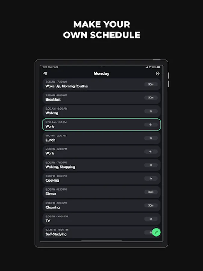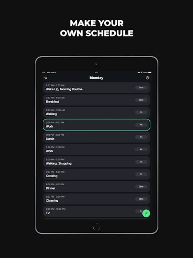 Using this daily schedule planner app, you can create a task list for every day of the week, for every hour and minute of the day. Thus, build new habits or get rid of bad habits or even solve everyday tasks using the time blocking technique. (Time blocking is a time management method that asks you to divide your day into blocks of time. Each block is dedicated to accomplishing a specific task, or group of tasks, and only those specific tasks.)