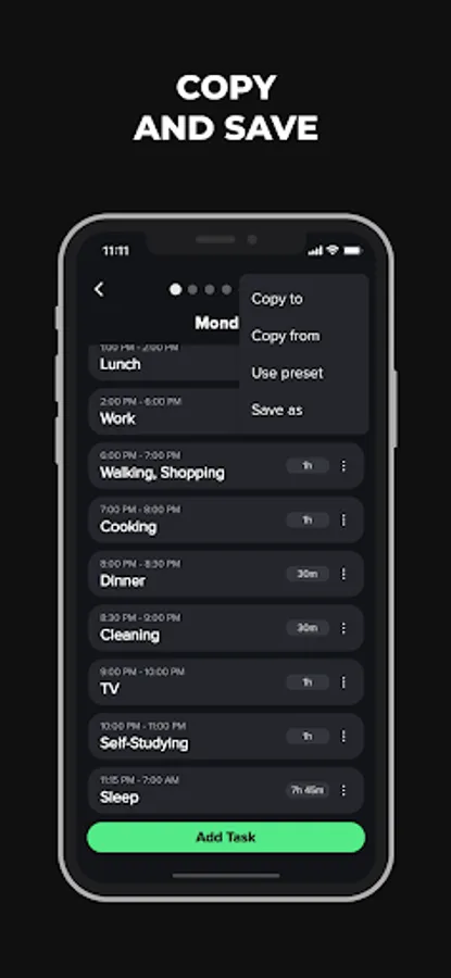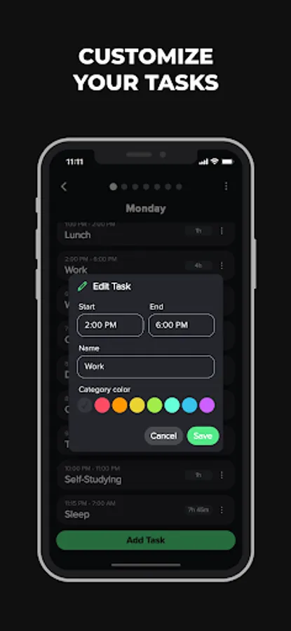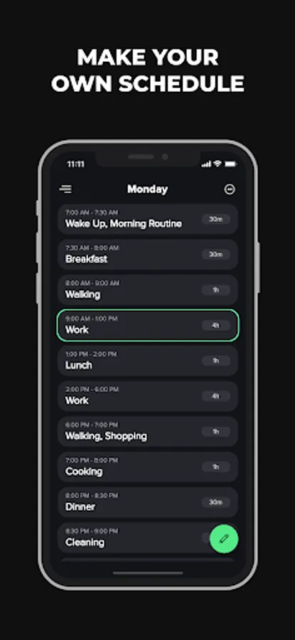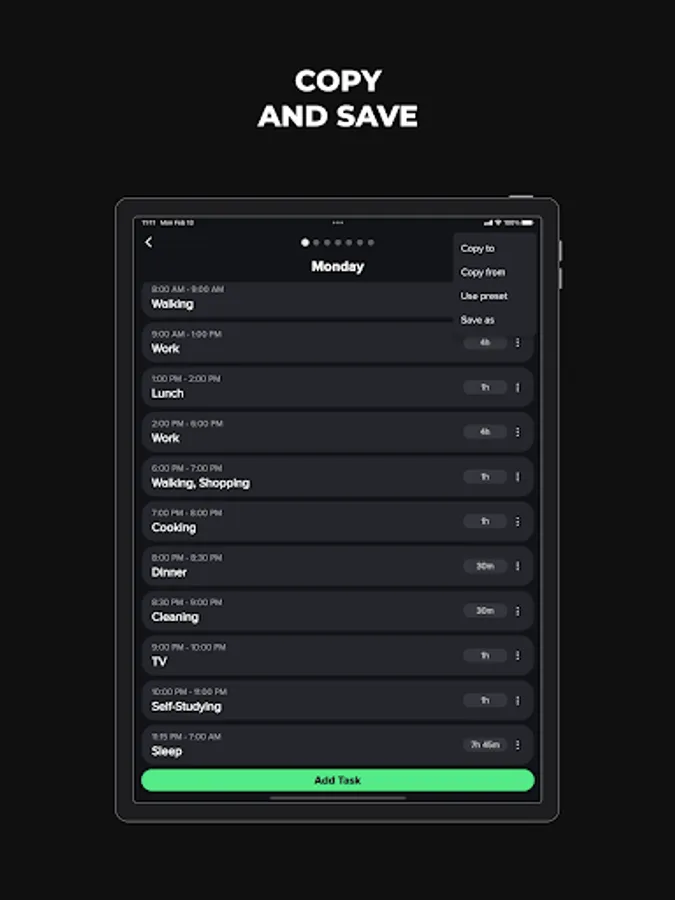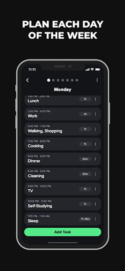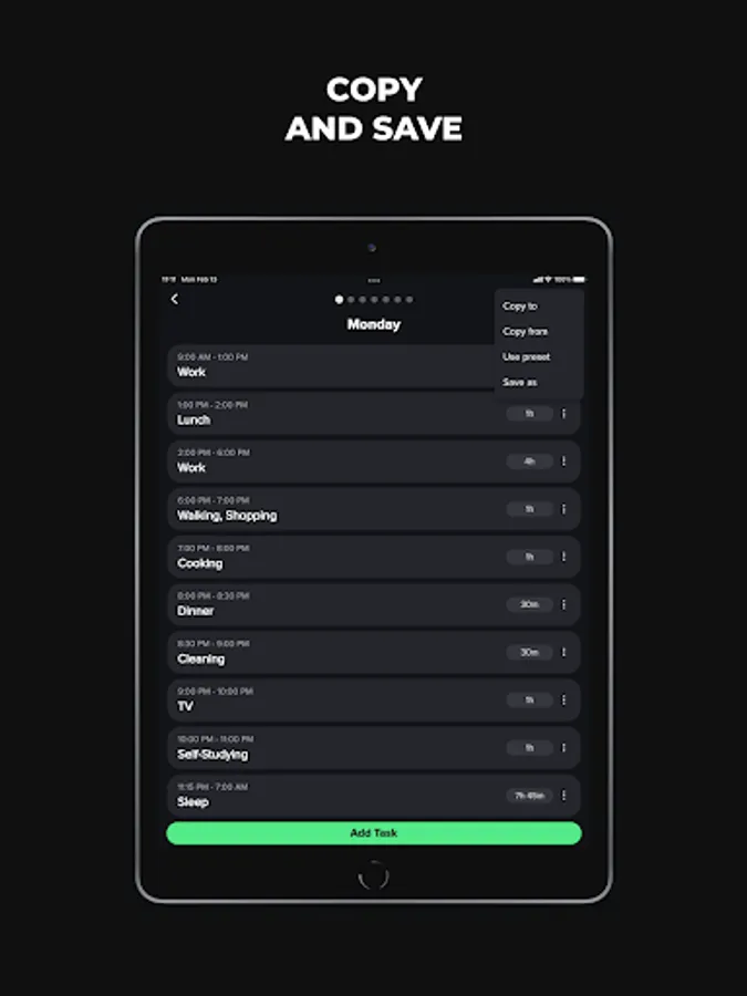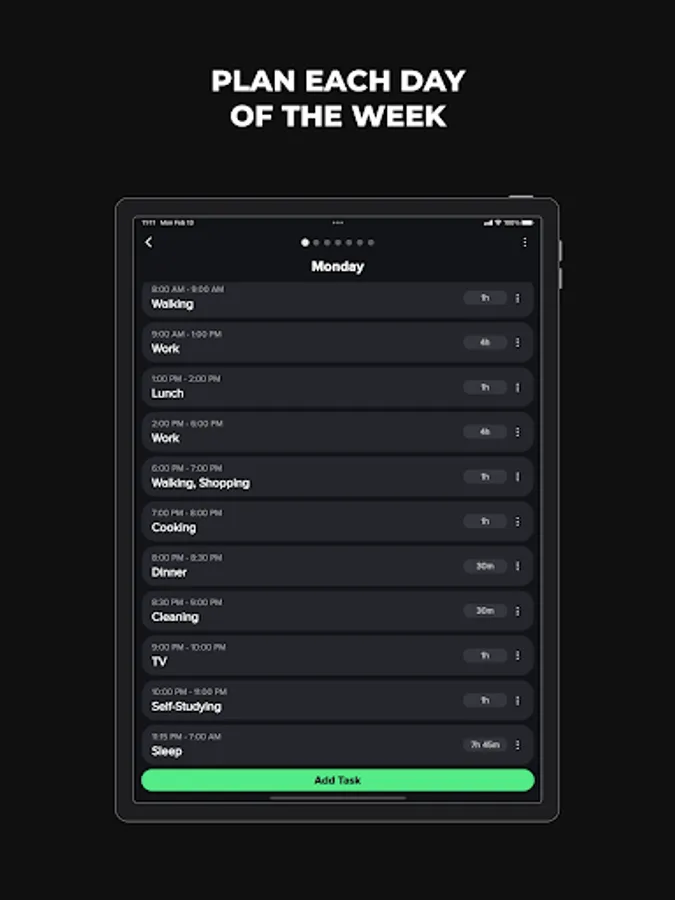 Using this daily schedule planner app, you can create a task list for every day of the week, for every hour and minute of the day. Thus, build new habits or get rid of bad habits or even solve everyday tasks using the time blocking technique. (Time blocking is a time management method that asks you to divide your day into blocks of time. Each block is dedicated to accomplishing a specific task, or group of tasks, and only those specific tasks.)