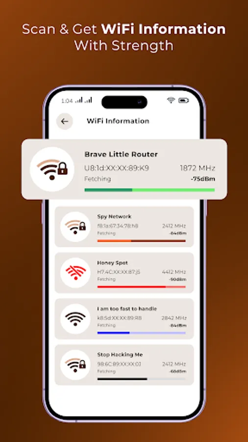 Wi-Fi Info : Scan and explore available Wi-Fi connections, complete with MAC address, bandwidth, and MHz details.