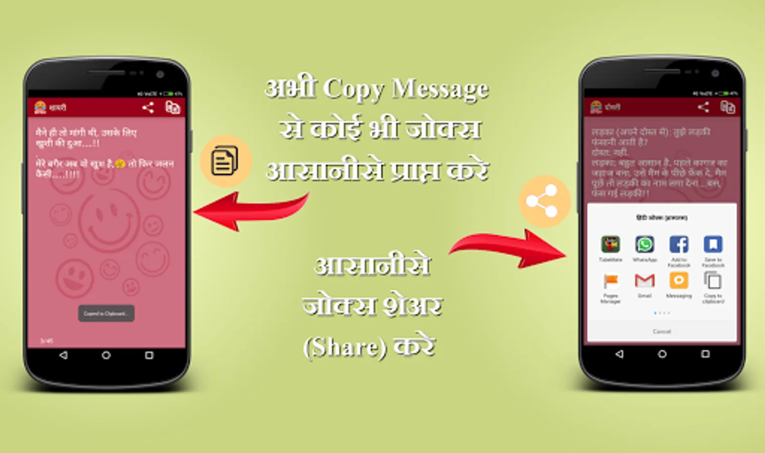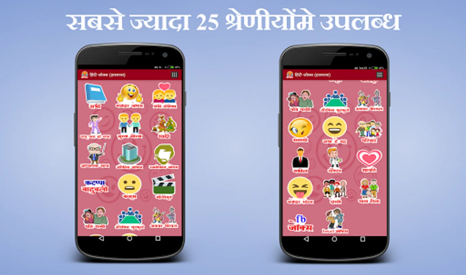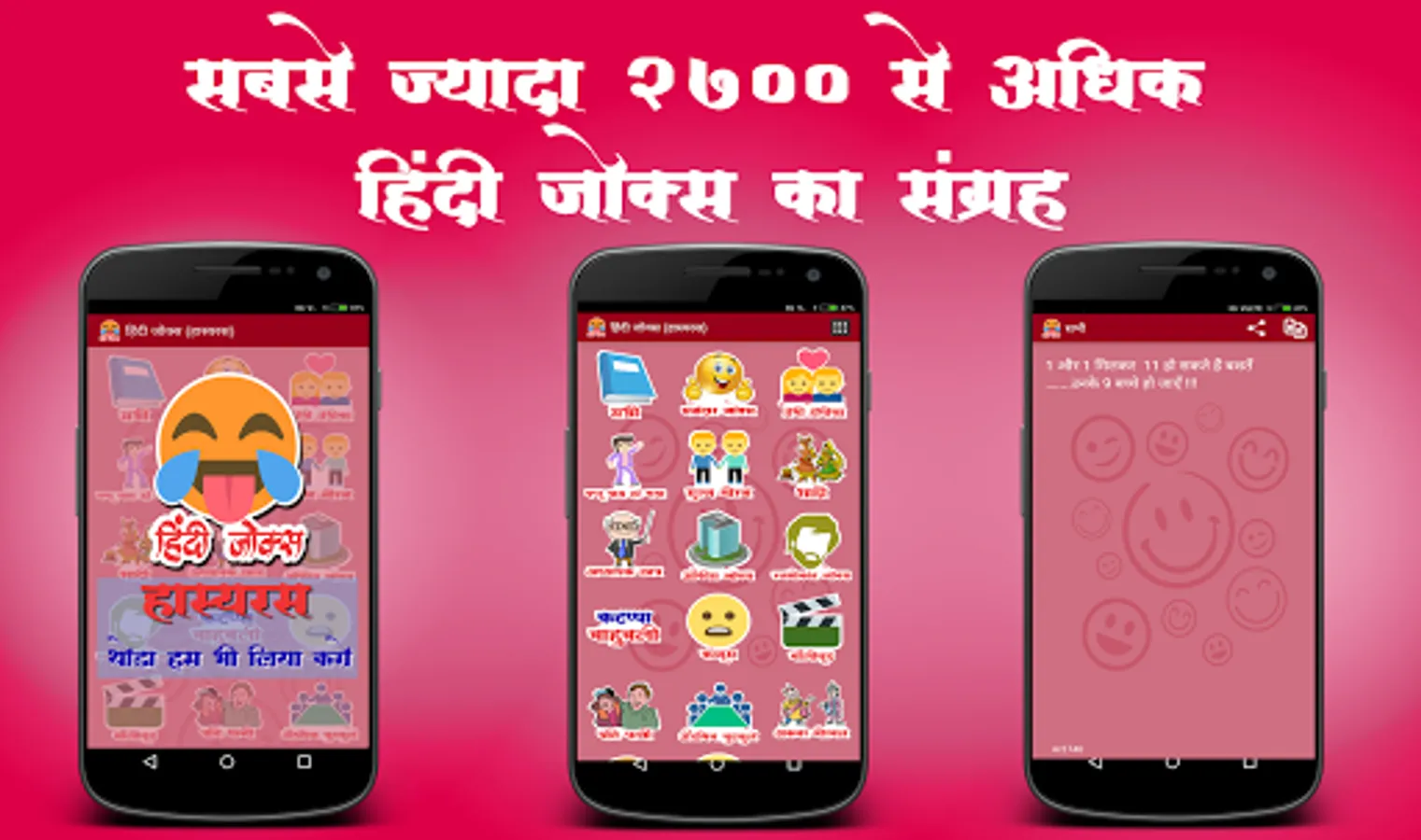 Now Laugh out loud with our "Hindi Jokes (Hasyaras)" app which contains all kinds of Hindi Language Jokes. This app consists of 2700+ Hindi Jokes with 25 different categories. You can share this jokes to your dear one. You can also share this messages with social networking apps. By using this app you can tell jokes to your friends and family members to make them laugh also.