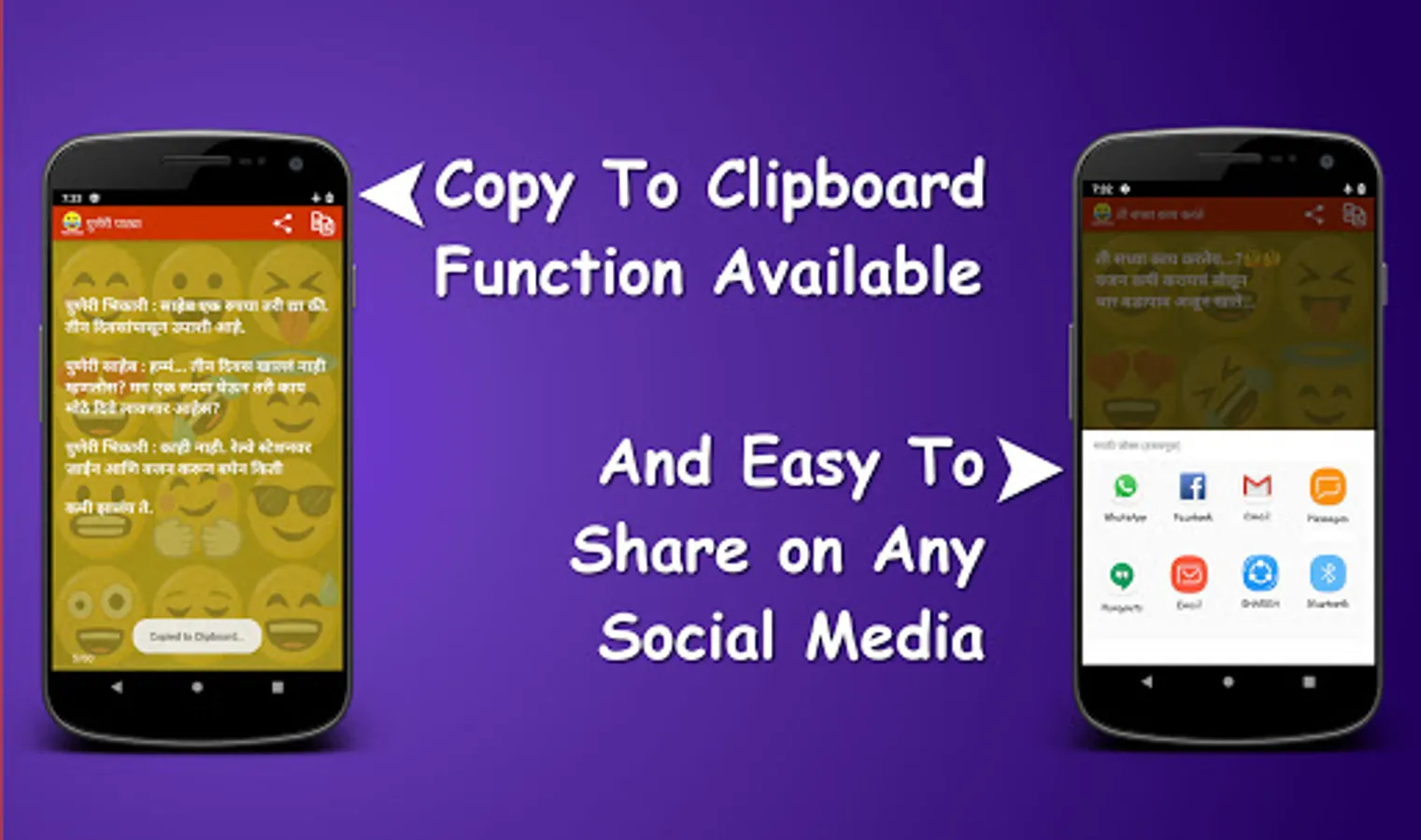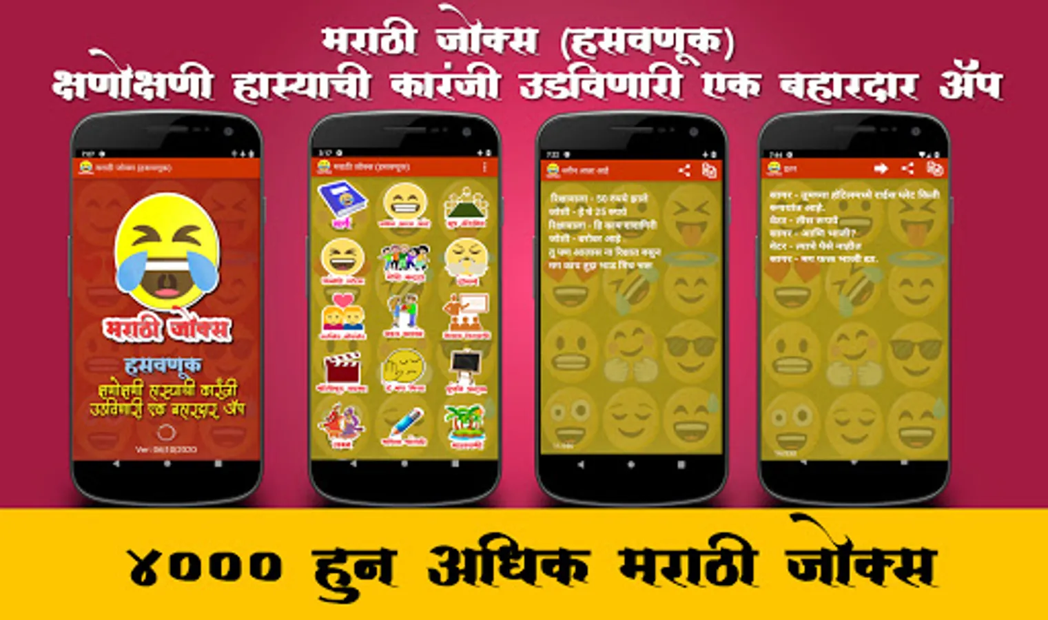 With more than 4000+ messages it contains the largest collection of Marathi jokes. Along with this there are 45 different categories, which is as follows:
