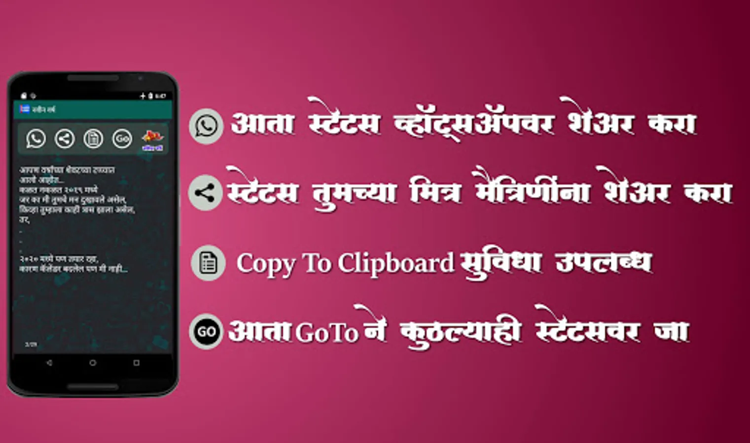 This app contains Marathi Language Status Messages for Social Media Apps with 47 different categories.
