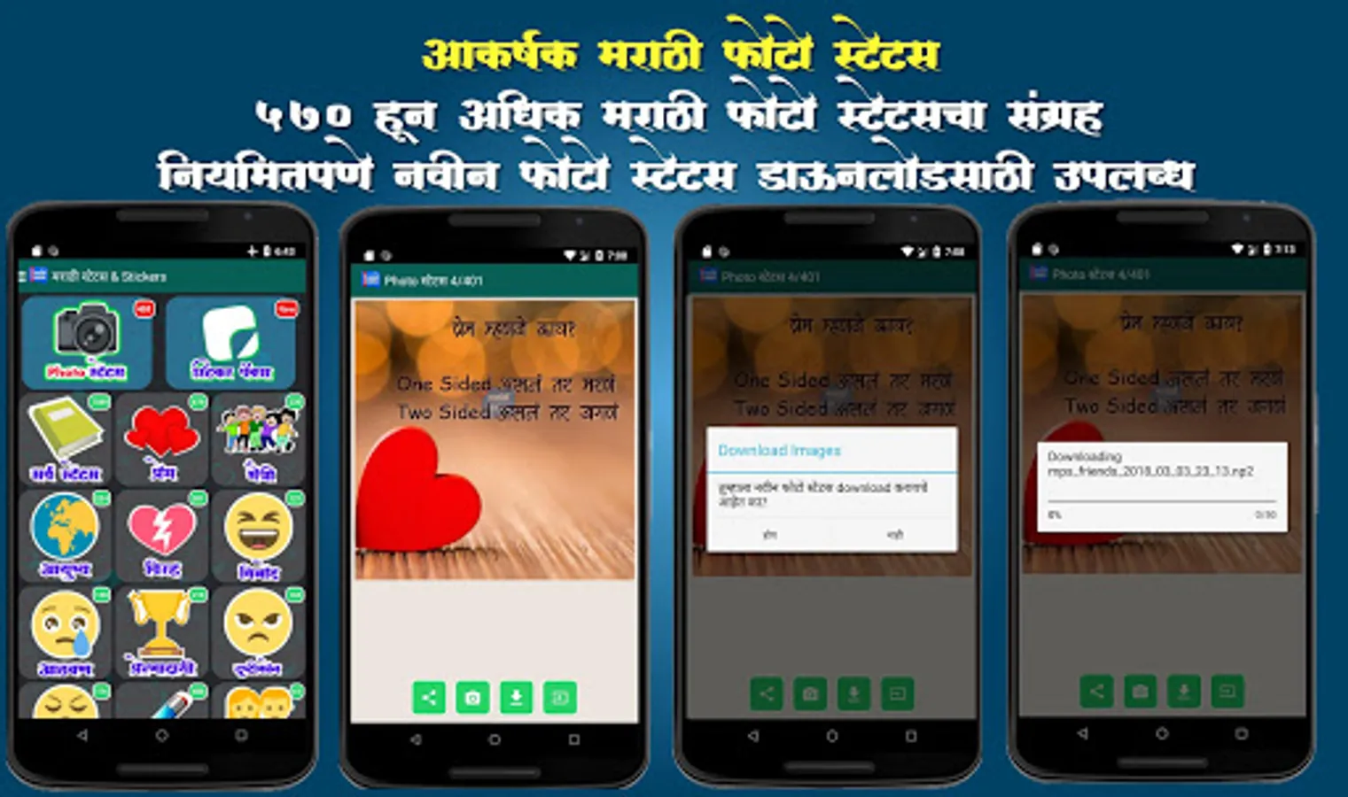 Now we added a new feature named as "Marathi Photo Status" which contains attractive profile photo images containing status, slogans and one liners which one can share on social media apps. This feature also provides option to download new images on daily basis.