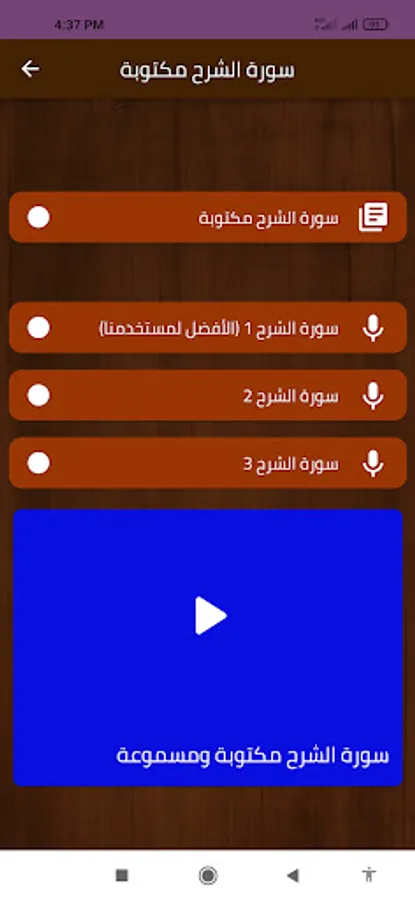 يحتوي تطبيق سورة الشرح مكتوبة على صوتيات وكذلك السورة مكتوبة ومسموعة،يحتوي تطبيق سورة الشرح مكتوبة أيضا على: