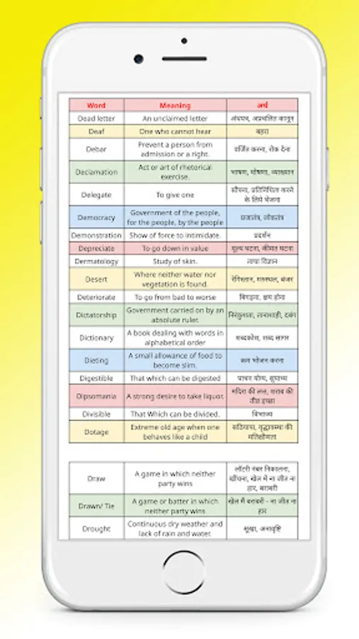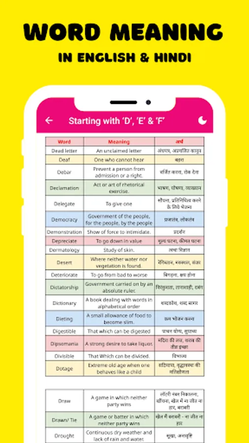 This Hindi English Vocabulary app covers more than 50000+ English Word meaning with 60+ topics in English Vocabulary for daily life words.