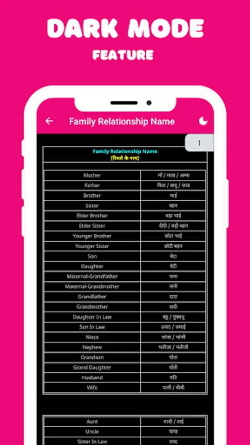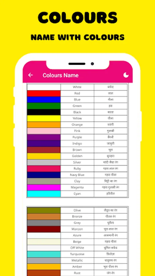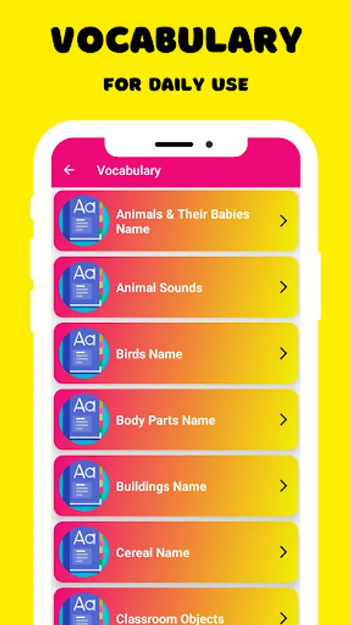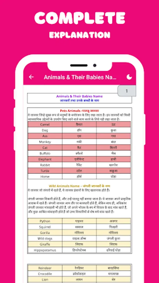 Vocabulary Builder: The app offers a vast collection of English and Hindi words and phrases, along with their meanings and usage. The words are classified into different categories such as animals, fruits, vegetables, body parts, etc., making it easy for you to learn and remember them.