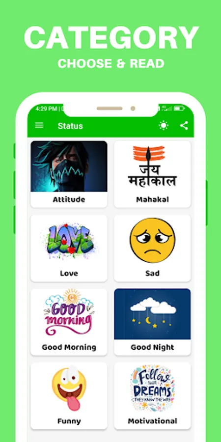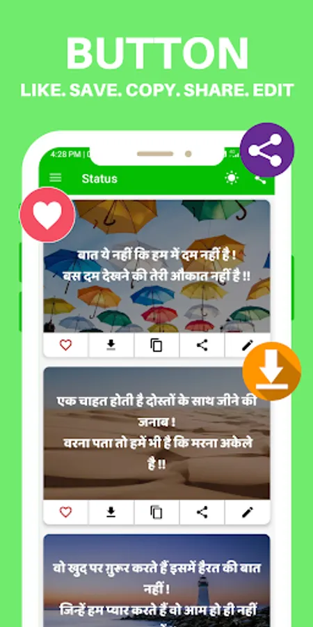=>Share Option: We have provided universal share option in our app. With the help of this feature you can easily share status anywhere.