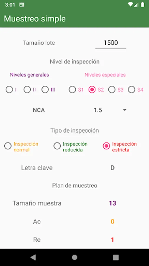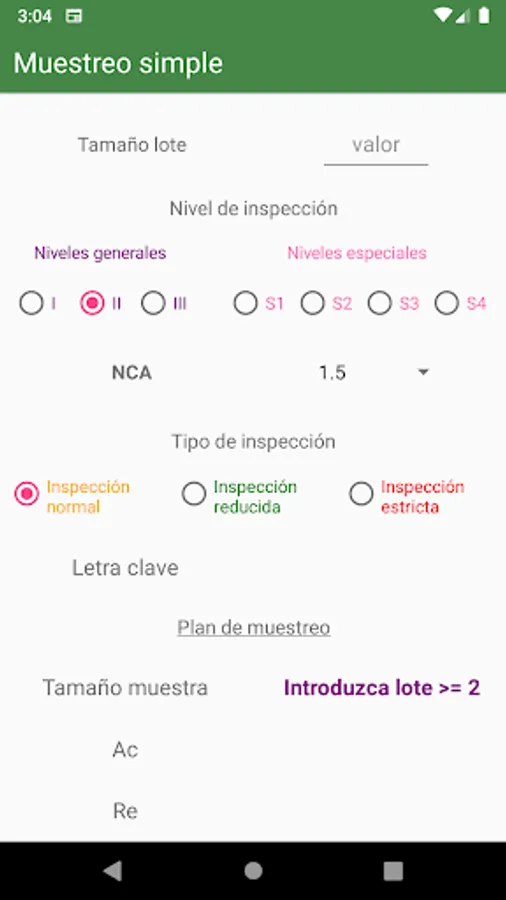 This application allows you to specify the lot size, inspection level and AQL.