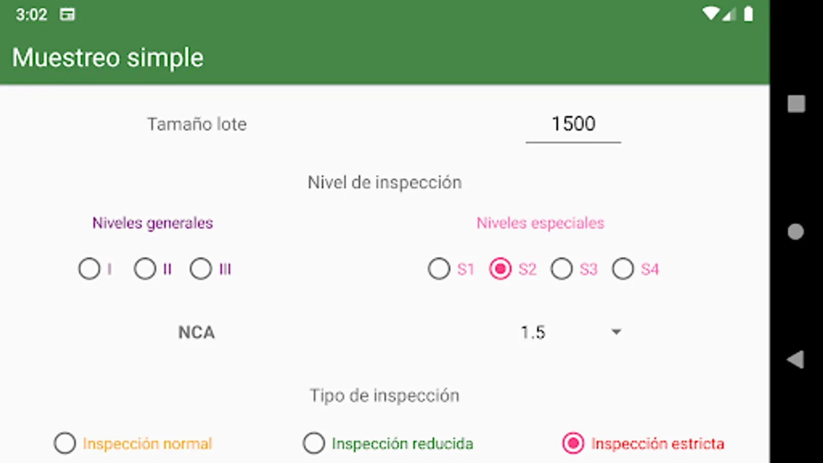 You can choose between general inspection levels (I, II and III) and special levels (S1, S2, S3, S4). You can choose AQL in a range of 0.01-1000 and the type of inspection normal, reduced or strict.