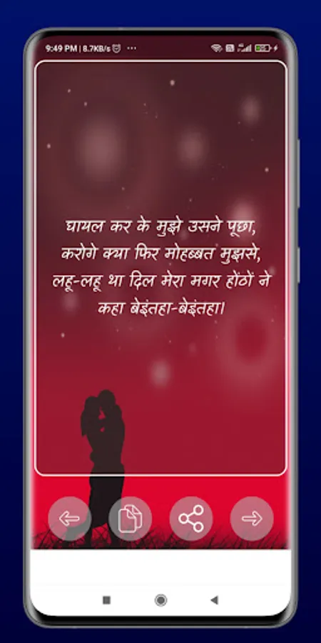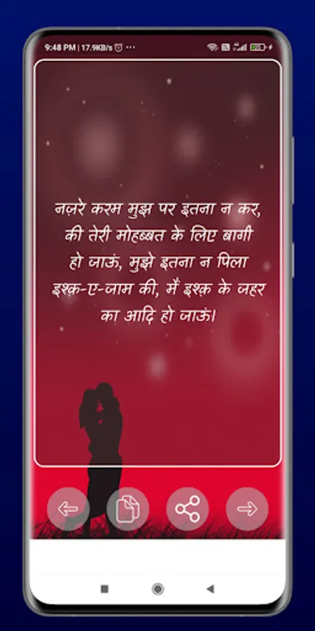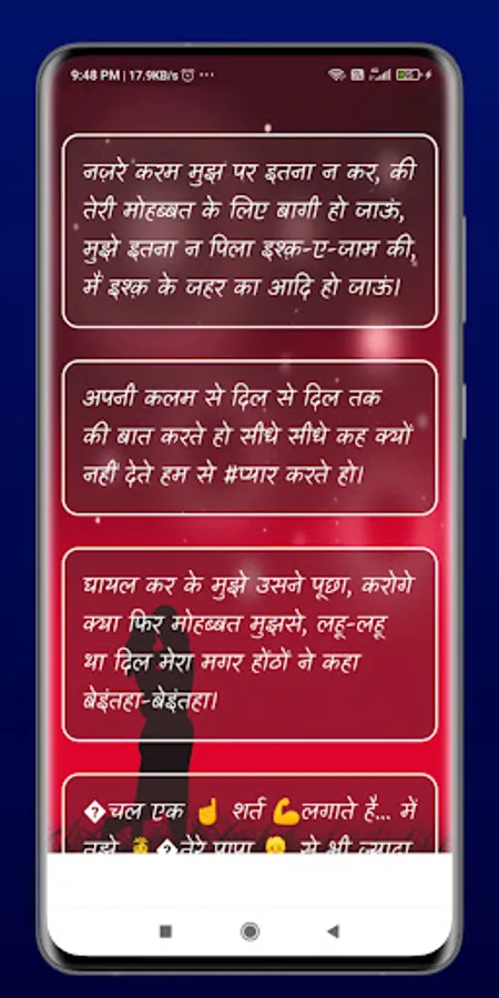 We hope, you will love this shayari app and will share this app in your friend circle. We developed this Hindi shayari app for you at free of cost. Thanks! for Downloading this Love Shayari Status App.