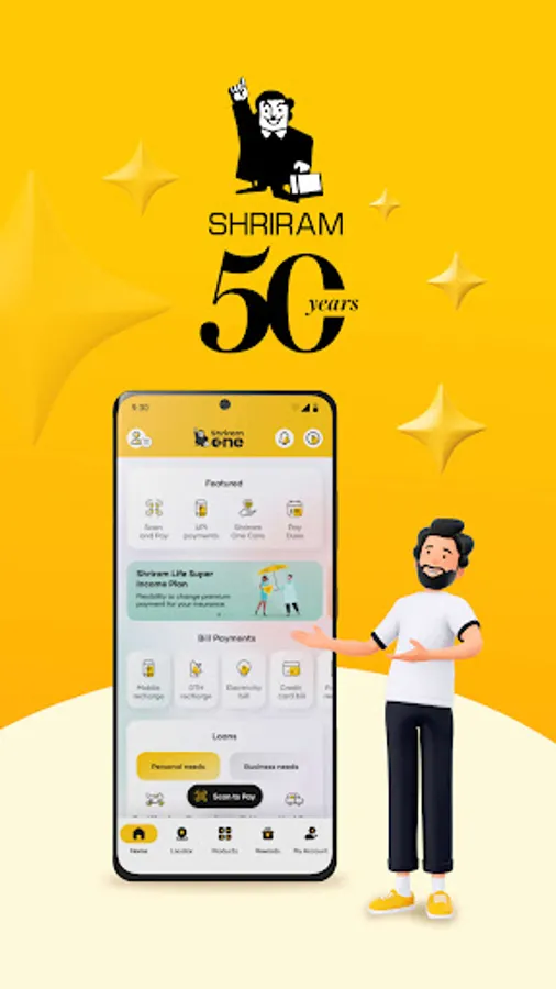 Shriram One is your one-stop-shop for all your financial needs. It offers investments, like FDs, Chits, Shriram One Gold, insurance plans, such as general and life insurance plans tailored to meet your specific needs and goals, customised loans, UPI, bill payments, phone recharge, credit health reports and much more.