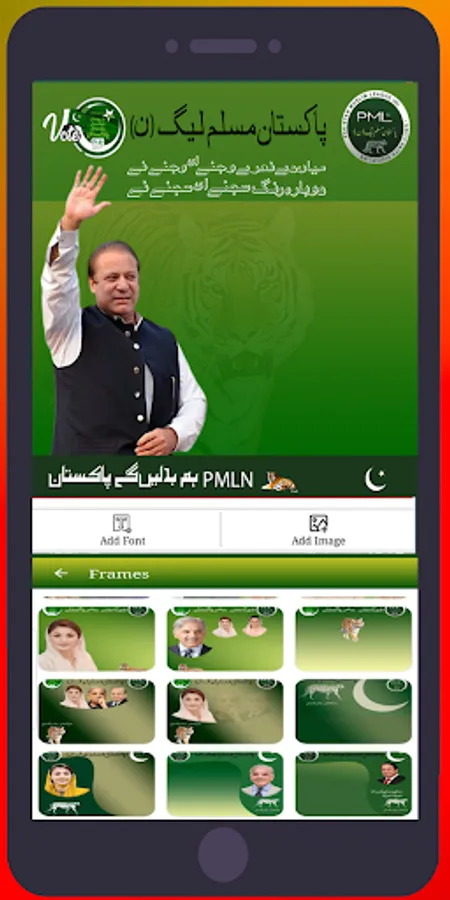 PMLN photo frames app lets you create amazing photo frames and banner with your own photos. pmln photo frames and text features write Urdu text on pictures to make pmln banners and pmln flex.