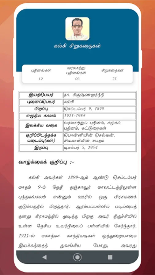 Kalki (September 9, 1899 - December 5, 1954) was a famous Tamil writer. His given name is Ra. Krishnamurthy.