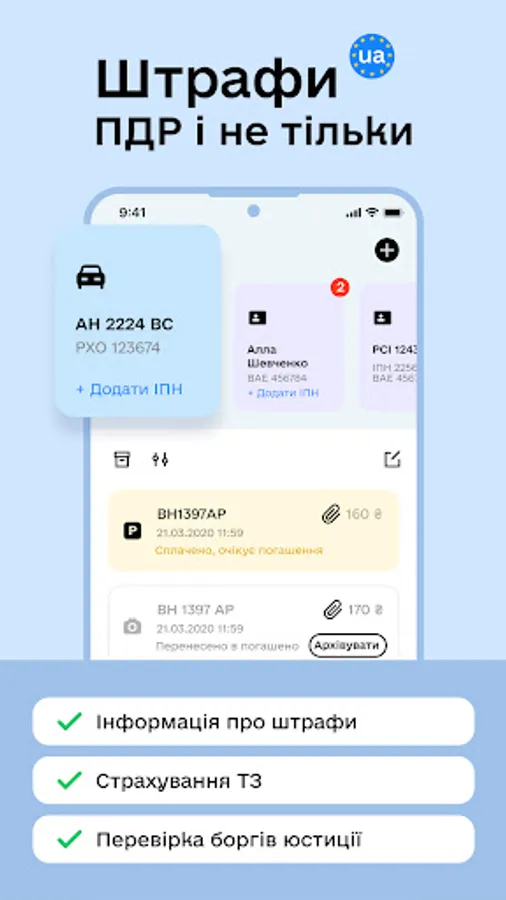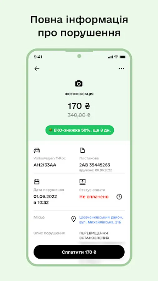 The first application in Ukraine follows the concept of the "State in a smartphone". Now you can pay traffic and parking tickets, track their status, maintain receipts and buy electronic CTP (OSAGO). After you have paid the fine, we will inform you about the payment status.
