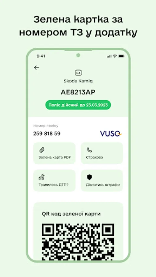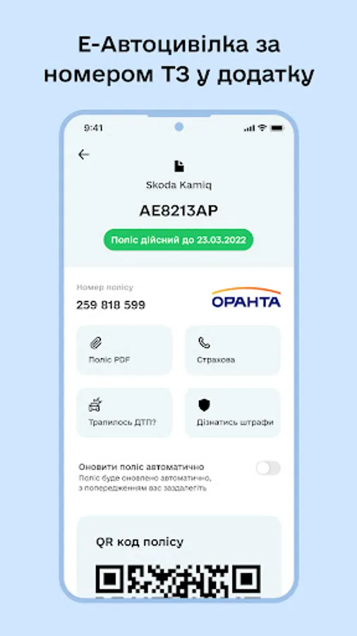 In case of inspection by the patrol police, all you need to do is to use the "Insurance" section of the Traffic Tickets UA app to confirm the number and validity period of your electronic CTP insurance or provide a visual form of your policy in PDF.