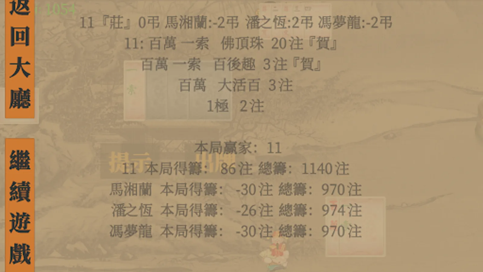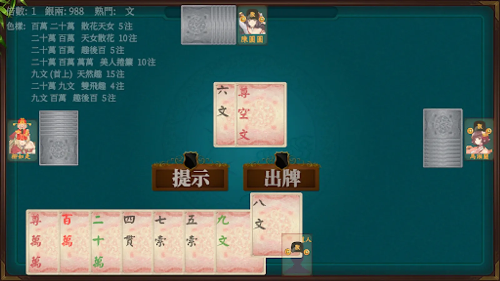The winning or losing of horse hanging is composed of hanging number: opening note: knocking on the door: color sample: Kan Chong and other parts [The Kan Chong part is similar to mahjong play, the current version has not been completed, it is under development, please look forward to it]