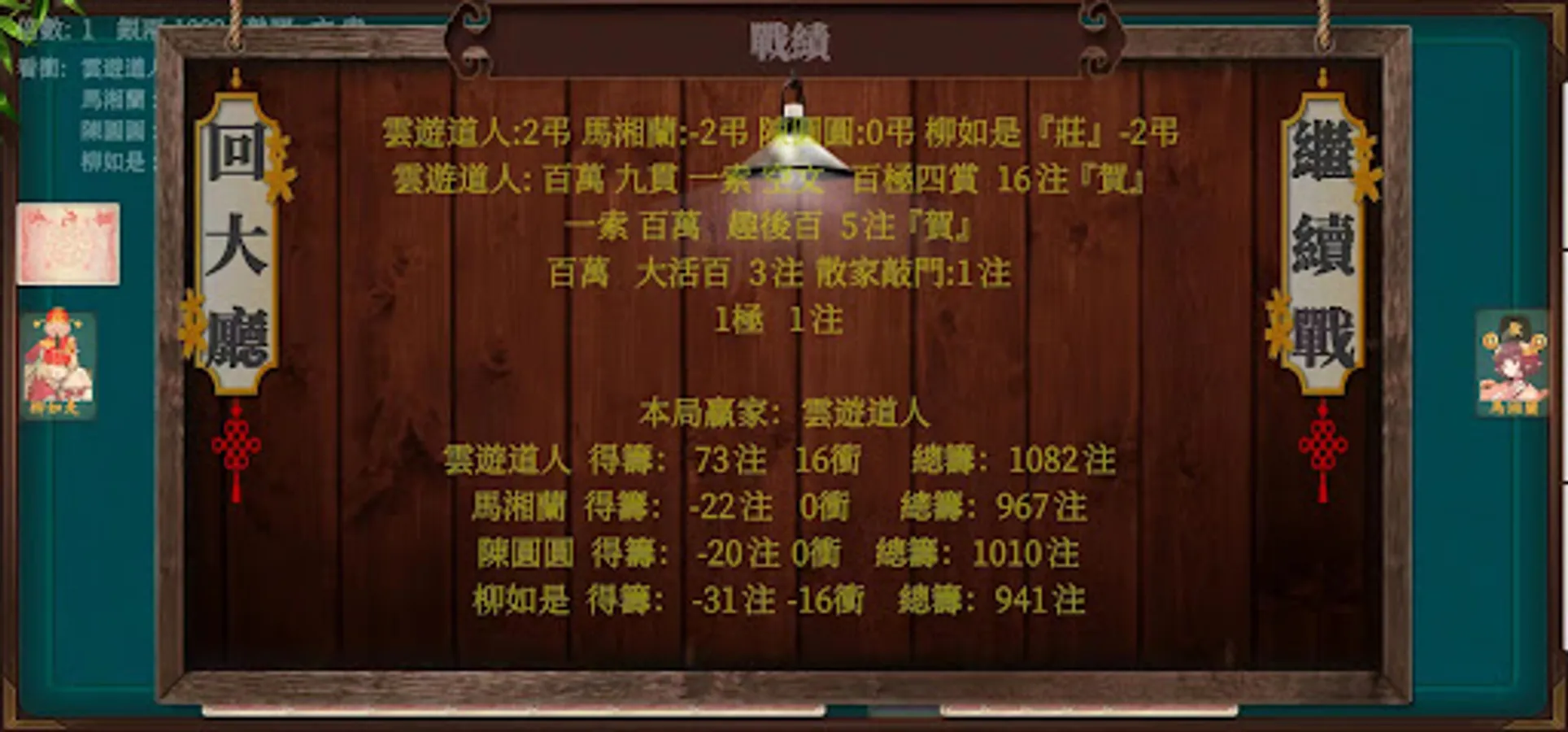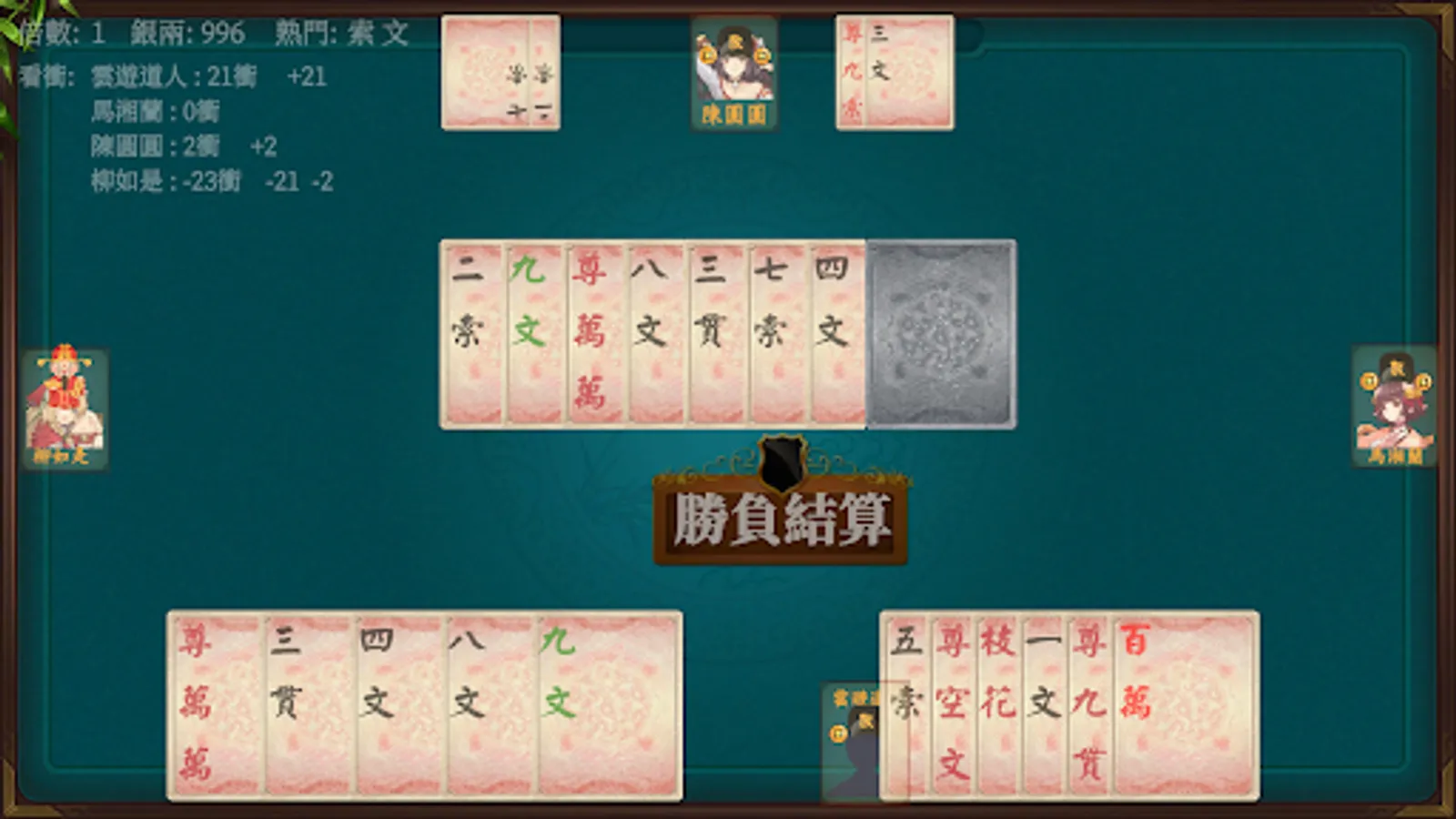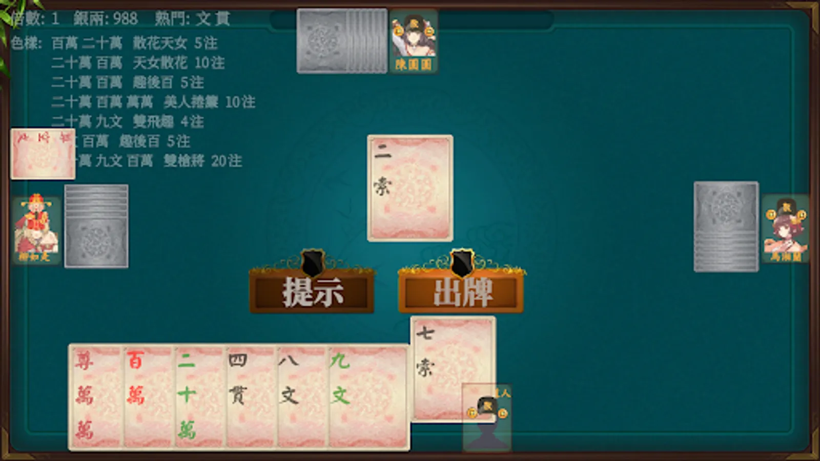 The winning or losing of horse hanging is composed of hanging number: opening note: knocking on the door: color sample: Kan Chong and other parts [The Kan Chong part is similar to mahjong play, the current version has not been completed, it is under development, please look forward to it]