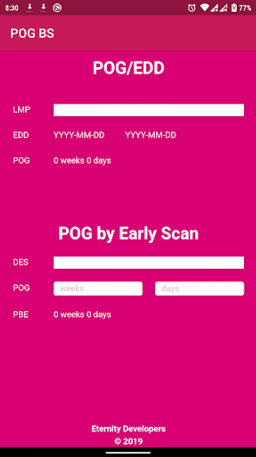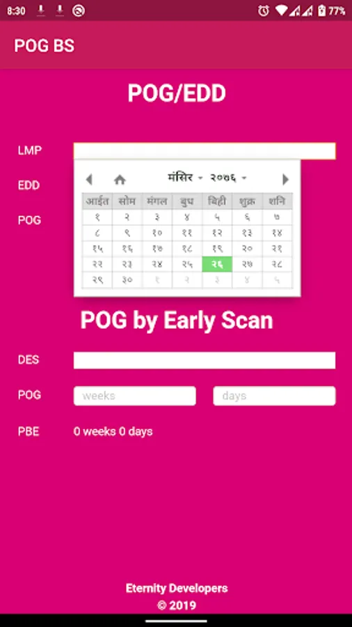 Calculates period of gestation (POG) and Estimated Date of Delivery (EDD) by Last menstrual period in Bikram Samwat (BS) as well as in AD.