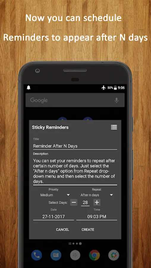 • Create: Create your custom notifications which always stays on the notification bar (even on lock-screen).