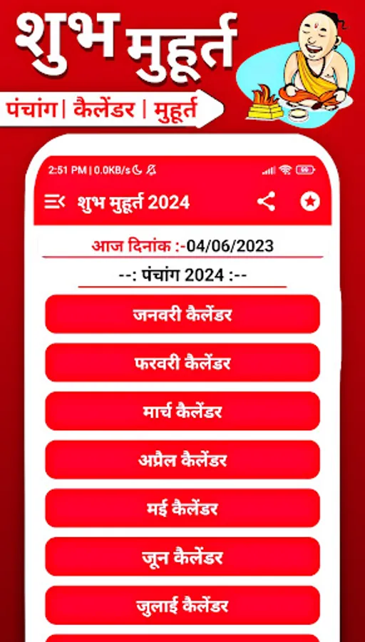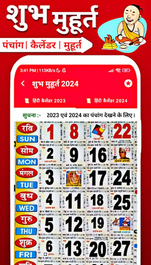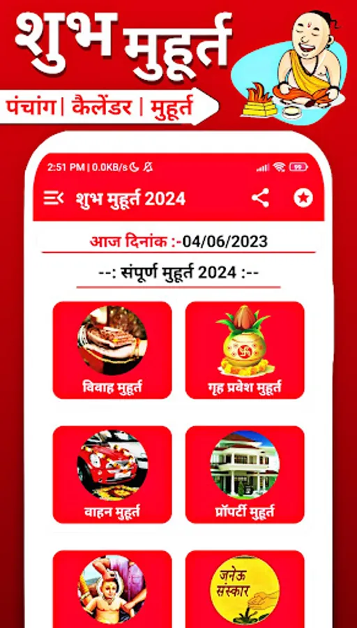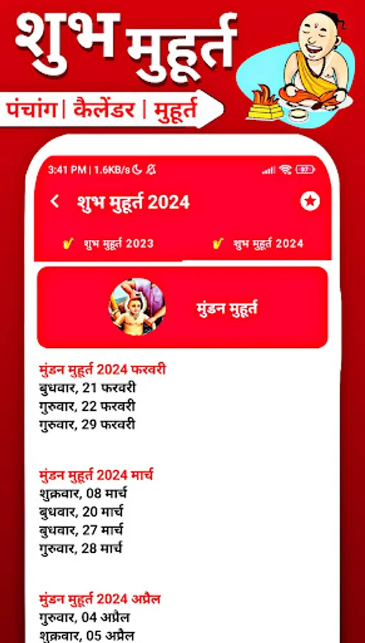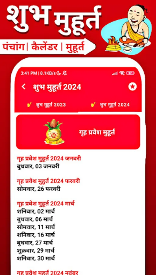 In this app, you will get a complete list of Shubh Muhurat 2024 in the Hindi Language. Muhurat means an auspicious time when all positive energies support you. In Indian culture, Shubh Muhurat is a very important thing before doing any type of auspicious work. Here you can get many types of Shubh Muhurats with dates and times also. You can use this app online and offline both ways.