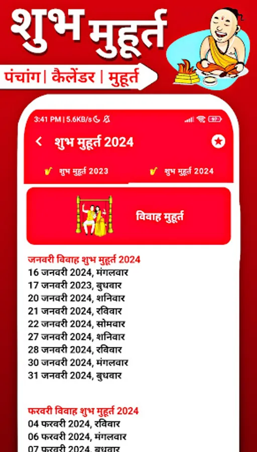 इस एप्प में आपको शुभ मुहूर्त 2024 दिए गए है जिसमे आपको सभी तरह के शुभ मुहूर्त एक ही जगह पर दिए गए है. इस एप्प को आप ऑनलाइन के साथ ही ऑफलाइन भी इस्तेमाल कर सकते है.