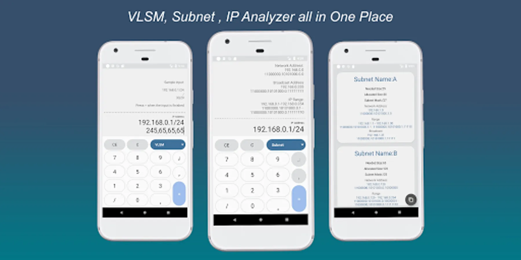 If you are a CS student or a IT Professional , this application is a perfect tool for you . Do VLSM and Subnet calculation in seconds . Save time and effort .