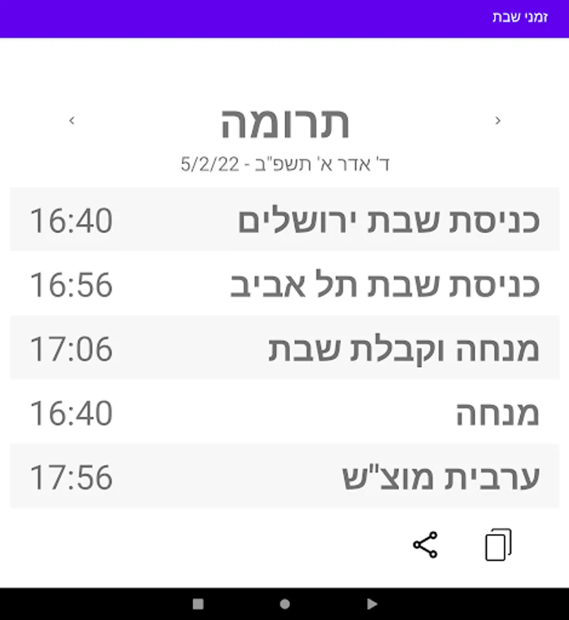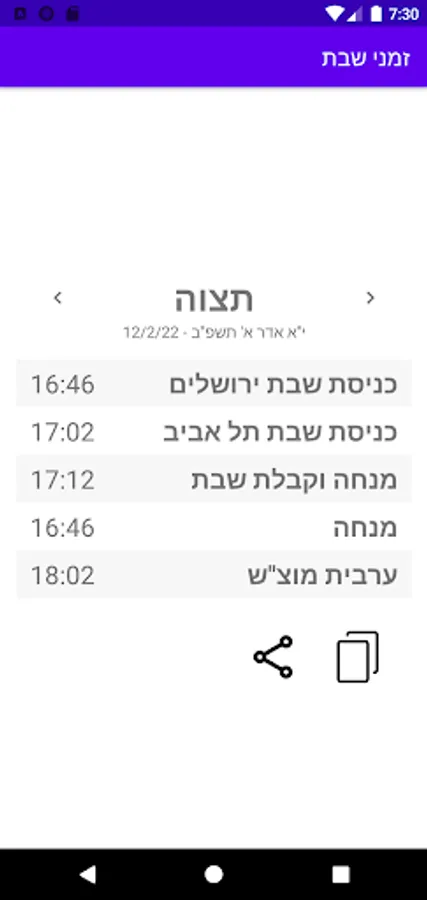 The app shows the Shabbat prayer times of the Beit Hillel Synagogue in Petah Tikva (formerly licensed).