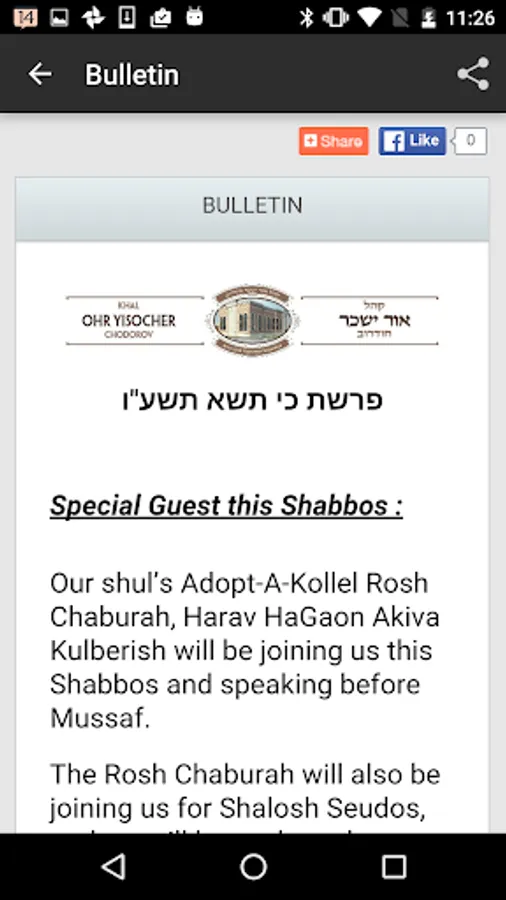 Khal Ohr Yisocher Chodorov app keeps you up-to-date with the latest news, events, minyanim and happenings at the synagogue. It also gives you the localized zmanim for the shul's location and the users current location.