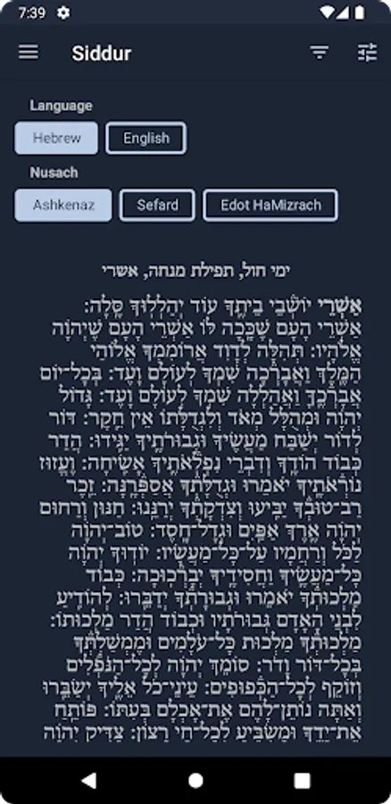 - Full Hebrew siddur in Ashkenaz, Sefard, and Edot HaMizrach variations with English translation, as well as a "do not disturb" functionality