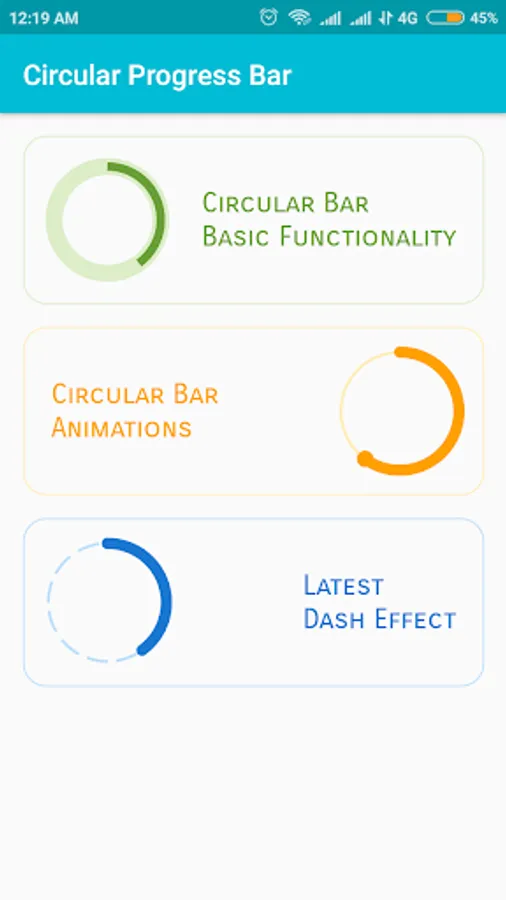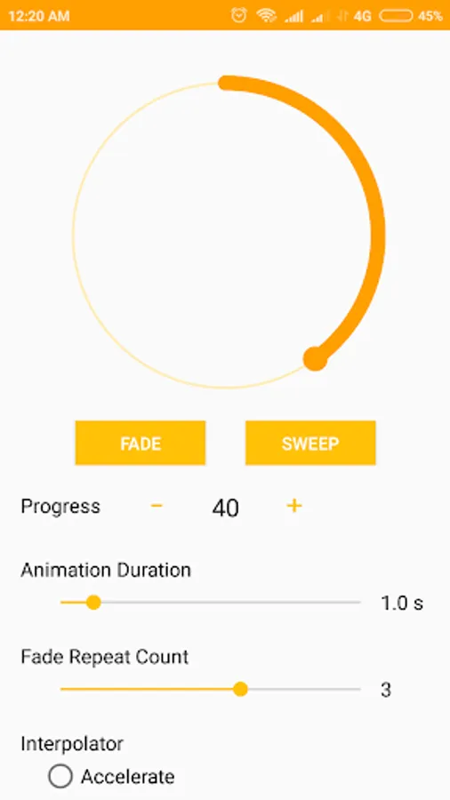 Offers all progress bar options like showing progress, clean sweep animation, stroke width and colour etc. It also offers fade animation (which user can show when the progress is 100%) and cool background Dash Effect.