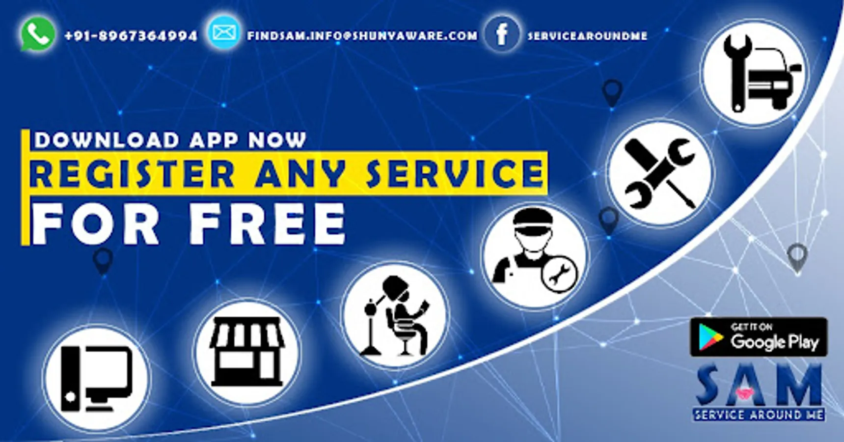 FINDSAM is an effort to assist you in finding a SERVICE PROVIDER through an automated search and short listing procedure based on your search parameters among our previously registered members. This application attempts to bring together all types of services and experts under one roof. Everything you need for your home or workplace may be discovered quickly and easily.