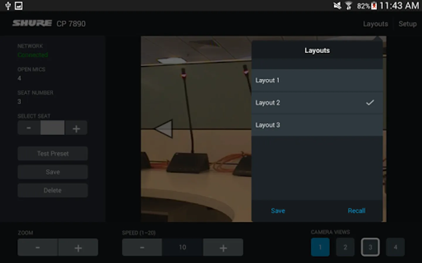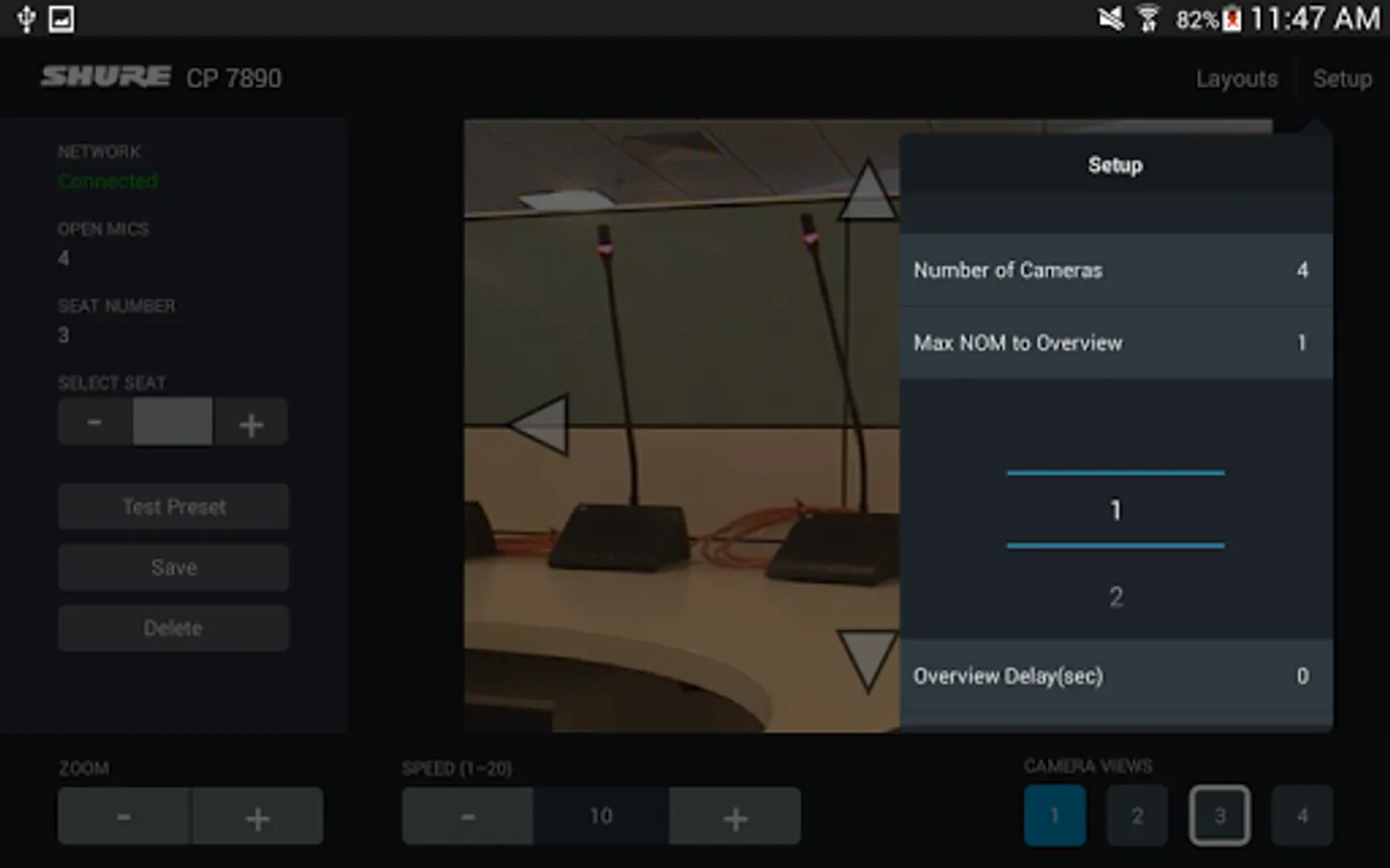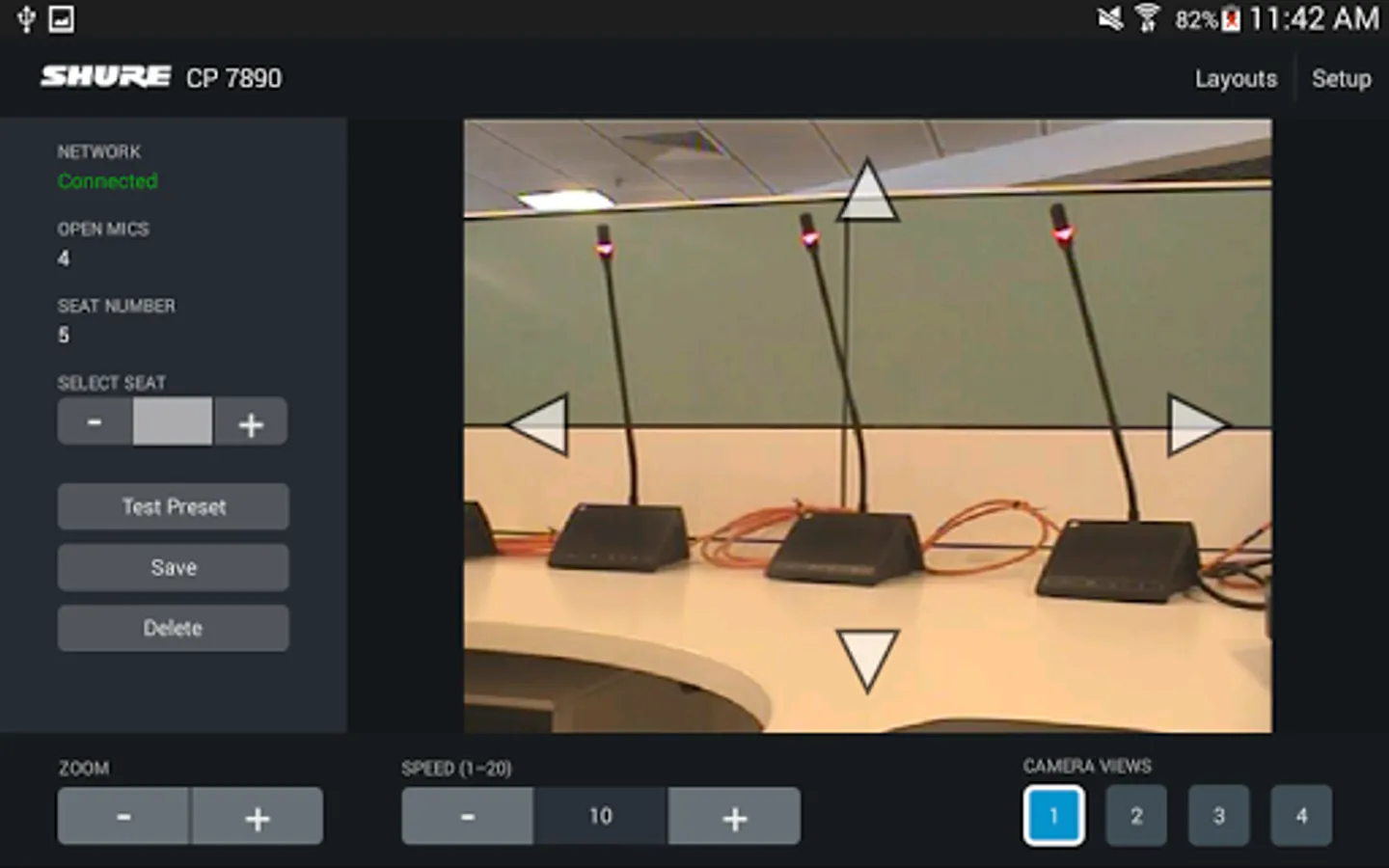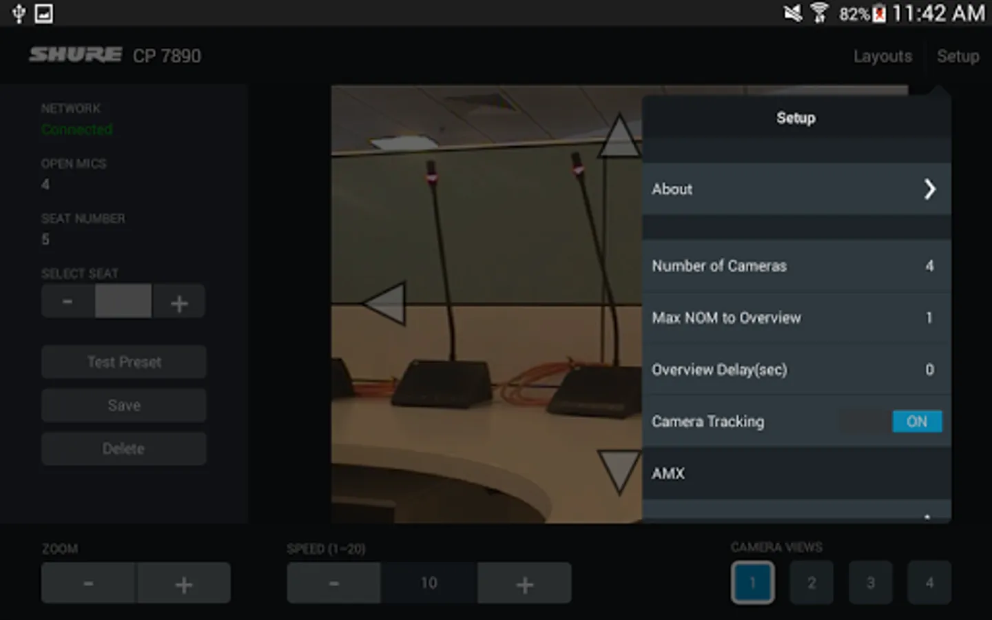 When used with the Shure CP 7890 Camera Control Package, the CP 7890 application allows conference system installers and integrators to create and save camera presets using an Android tablet. The application allows up to 400 preset camera views to be created using up to 4 video cameras. Presets can be saved for three different room layouts to accommodate frequently used seating configurations. With an optional video encoder, the current camera view can be displayed directly in the app.