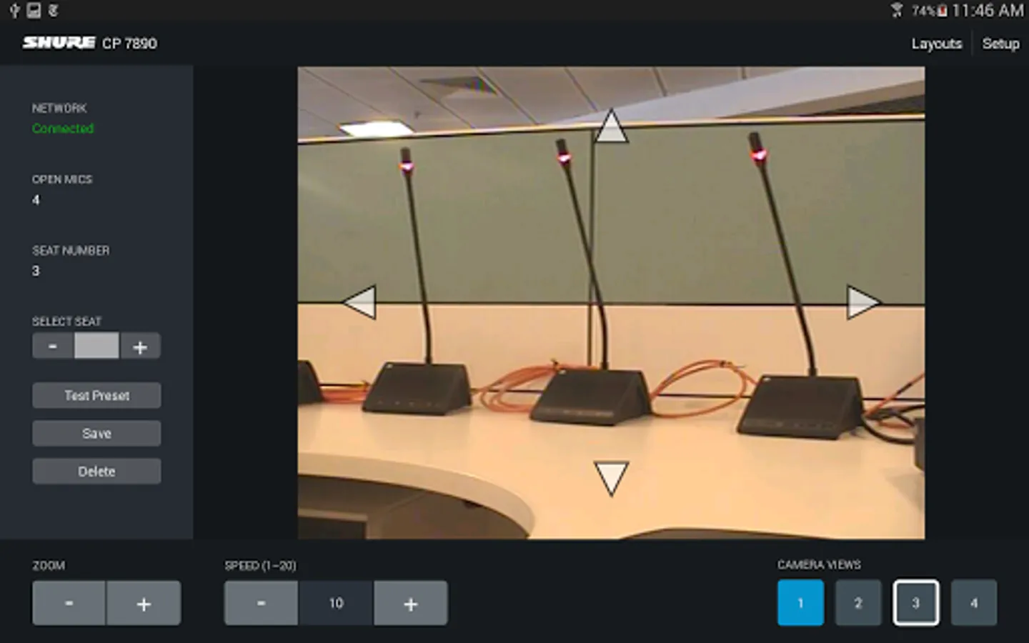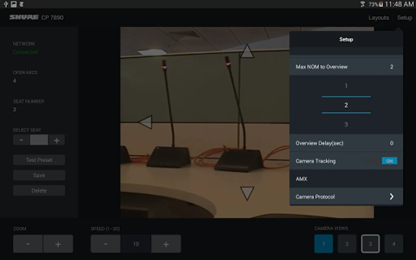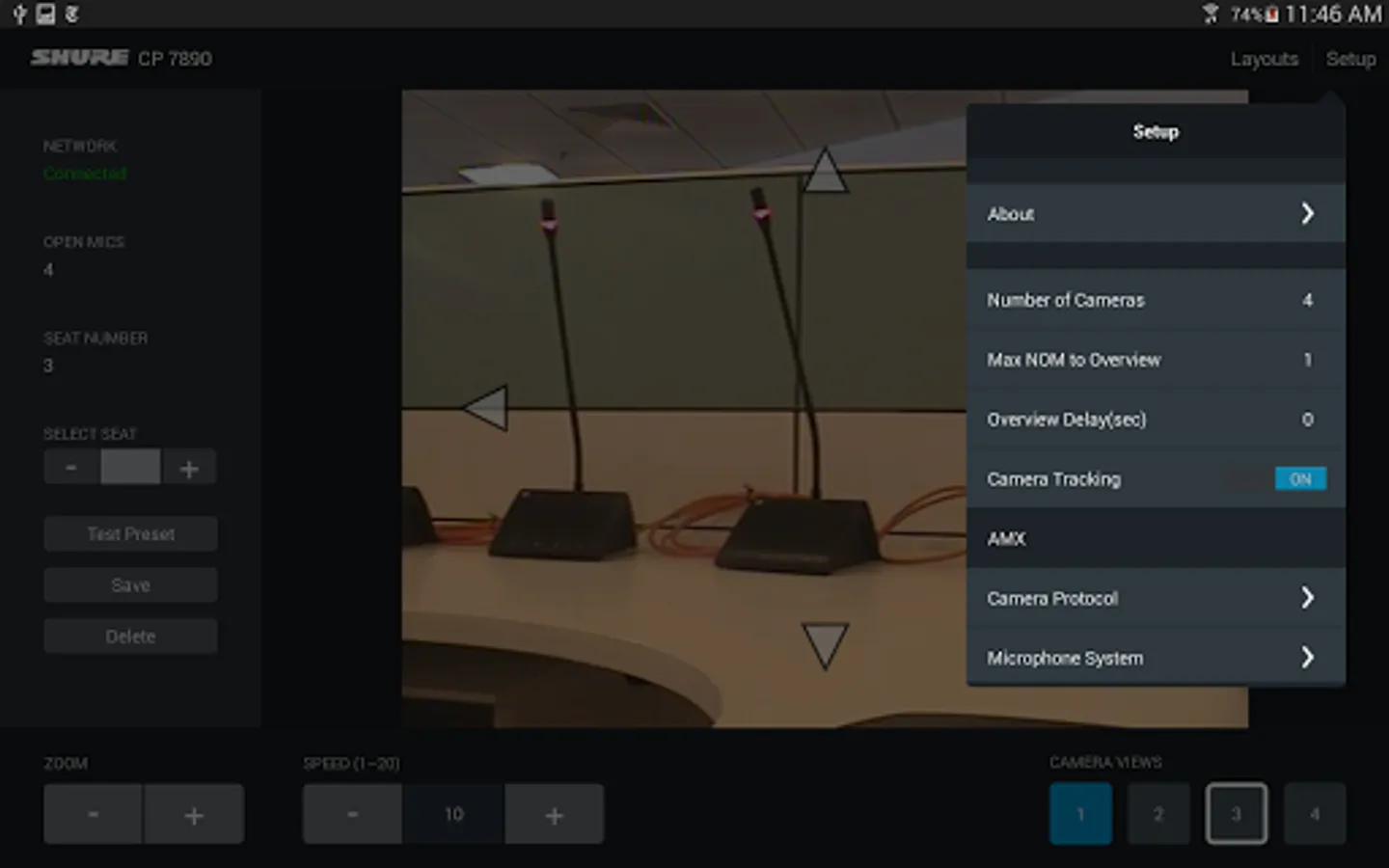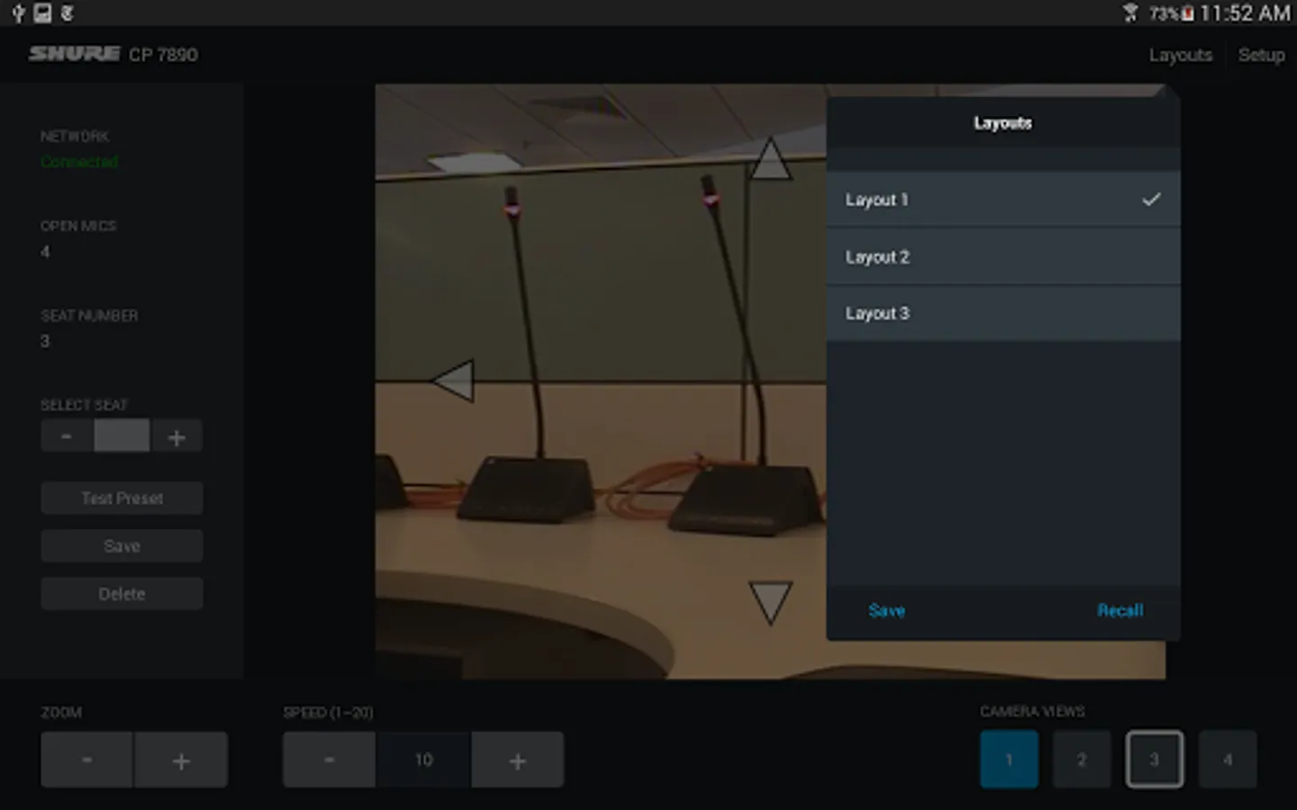 When used with the Shure CP 7890 Camera Control Package, the CP 7890 application allows conference system installers and integrators to create and save camera presets using an Android tablet. The application allows up to 400 preset camera views to be created using up to 4 video cameras. Presets can be saved for three different room layouts to accommodate frequently used seating configurations. With an optional video encoder, the current camera view can be displayed directly in the app.