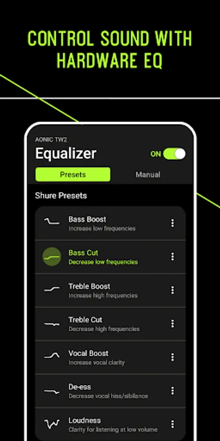 • Customizable EQ in the app or on your device — choose a preset or create your own