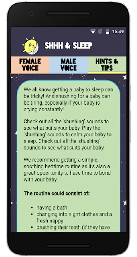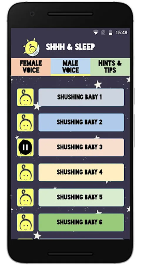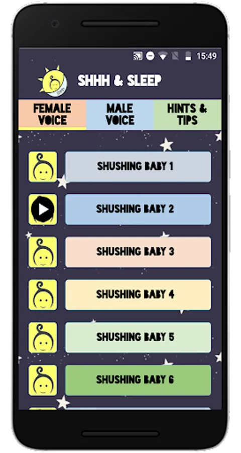 Using the app is simple, just play the shushing sounds close to your baby and the app will play continuously until you switch it off. Your baby will calm down, relax and then drift off to sleep.