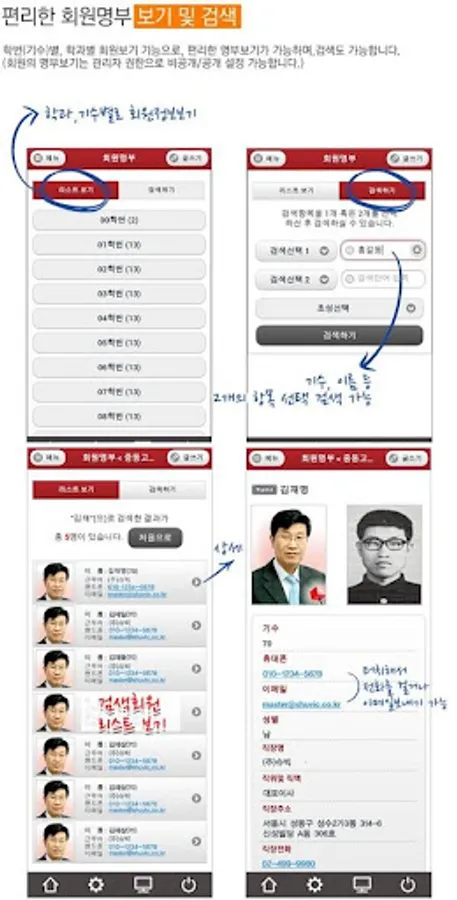 6. If you search for and select a member in the member list, you can see photos and contacts, and you can send it immediately by selecting a phone or email. (No separate membership booklet required)
