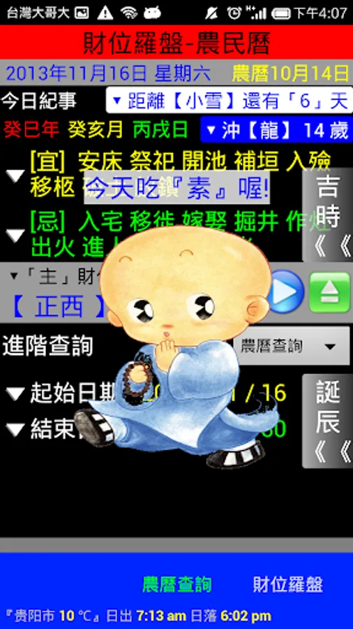 3. [Advanced search]: start and end date according to the query "Lunar Date", "Lunar date", "God of Wealth orientation", "happy God bearing", "Taboo inquiry", "solar terms Date", "should Avoid date "," Oki Zodiac, "" Buddha's Birthday, "" child of God query "query by date of birth," Life Gua inquiry "," life Gua compass "," Wenchang query "show each bone mass of" life Heavy inquiry "
