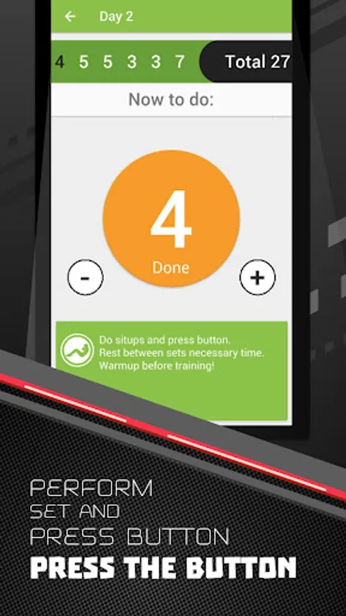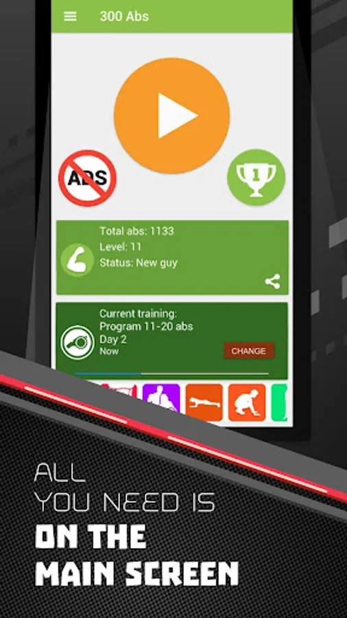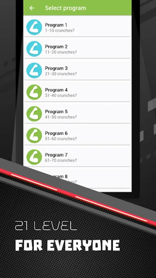 Workouts divided into 21 programme from 0 to 300 sit-ups. Choose the right program for you depending of your training level.