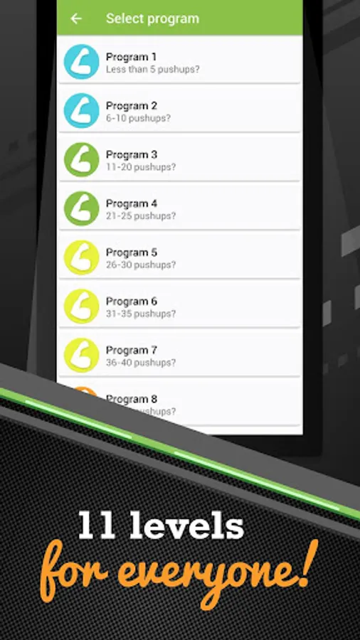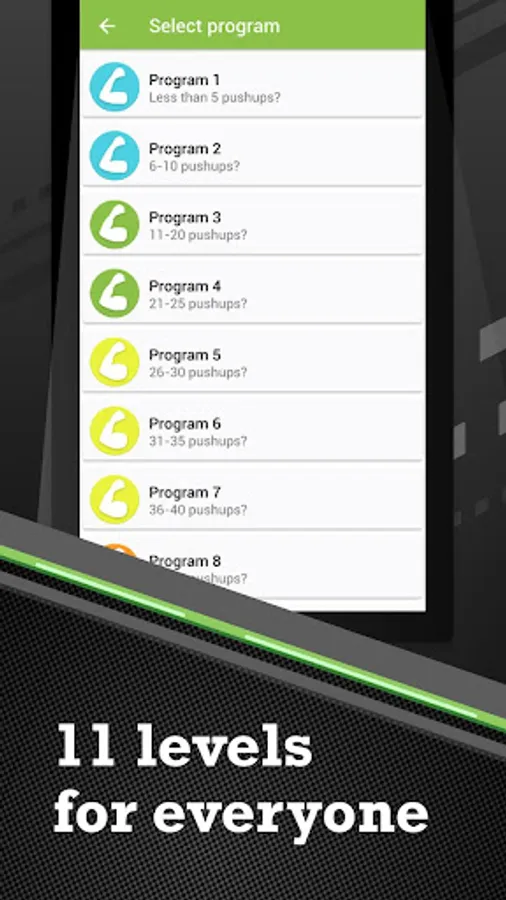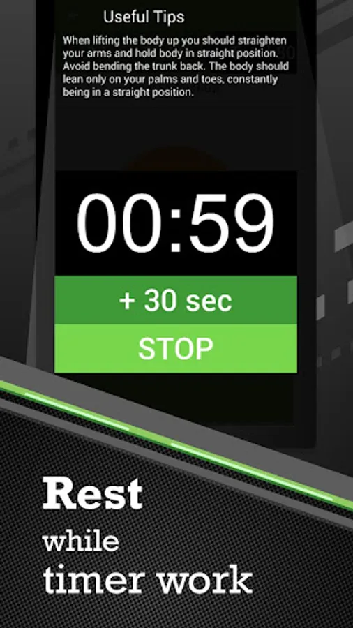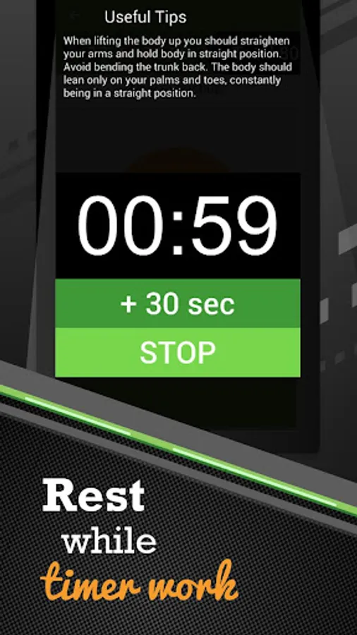 Program rules: before start workout pass the test. The aim of the test is to determine maximum number of push-ups that you can do in a row. Then based on the test result chose the program and start workout. Press the button after each approach to show the timer for rest (you can rest in a recommended time or change it according to your feelings). Follow the mode of rest and proper nutrition.