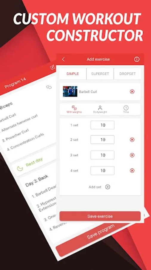 Build muscle, gain strength, tone up, or lose fat with our library of over 100 predefined workout plans. From forearm and shoulder workouts to cardio and full-body routines, GymTrainer has it all.