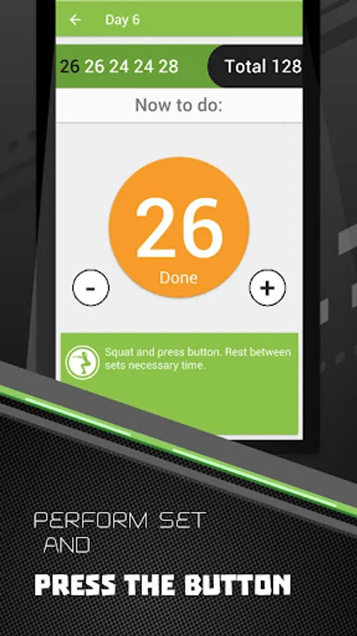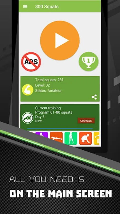 300 Squats - it is one app from great series of programs "Be Stronger". Combining all programs from the cycle (100 push-ups, 300 sit ups, 50 pullups) you will get a strong and healthy body in record time.