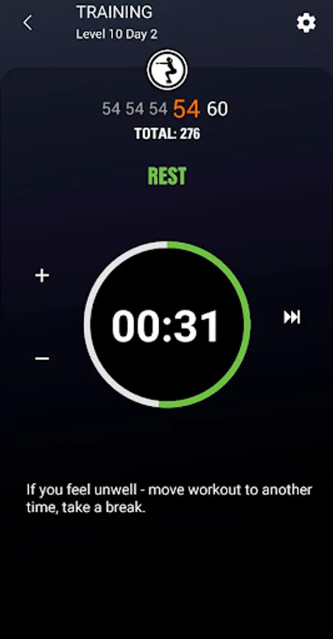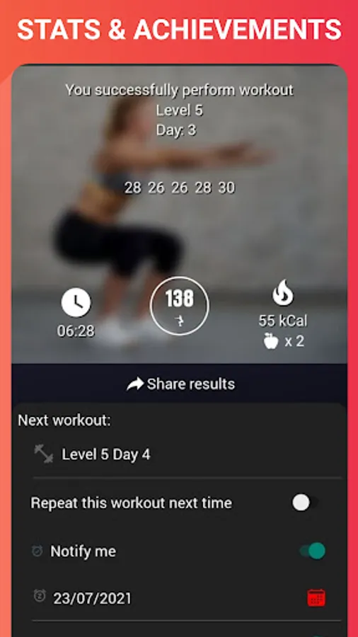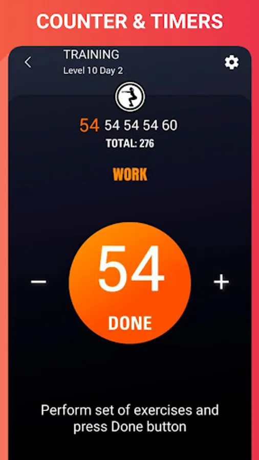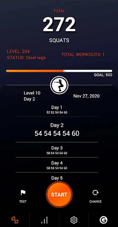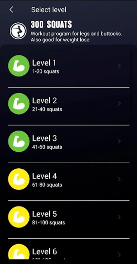 The workouts are divided into 15 programs ranging from 0 to 300 squats. Choose the required program depending on the level of your training.