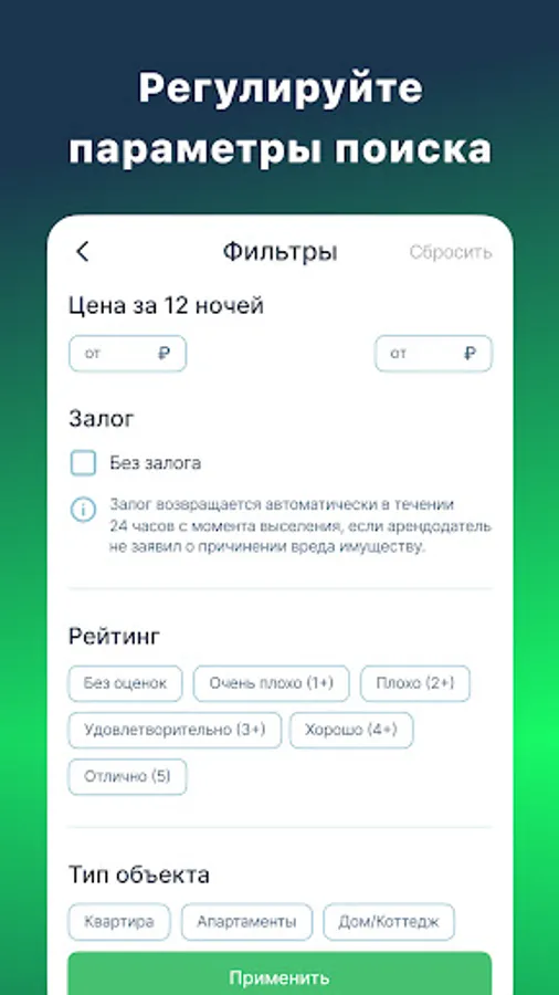 Find great deals and check into apartments even at night! In any unforeseen situation, you can count on the Flatsharing app. Convenient search and contactless booking will allow you to quickly and easily find accommodation.