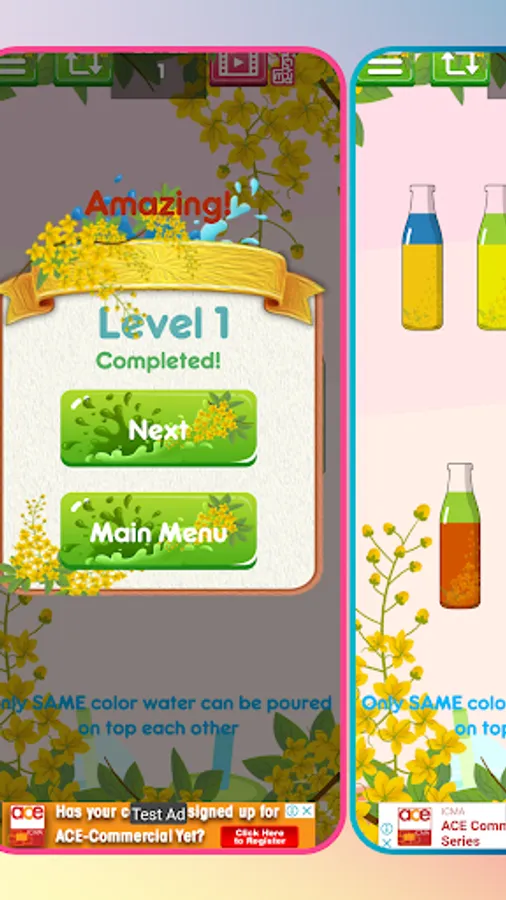 Color Waterfest Puzzles Games is not only a fun relaxation but also testing how smart you all are. Test your intelligence by solving color water puzzles. Sort them all. These puzzle games stimulate your brain in a very fun and challenging way. Enjoy on every level and challenge yourselves and let’s see how good you are at juggling the colors in different water bottles into respective bottles.