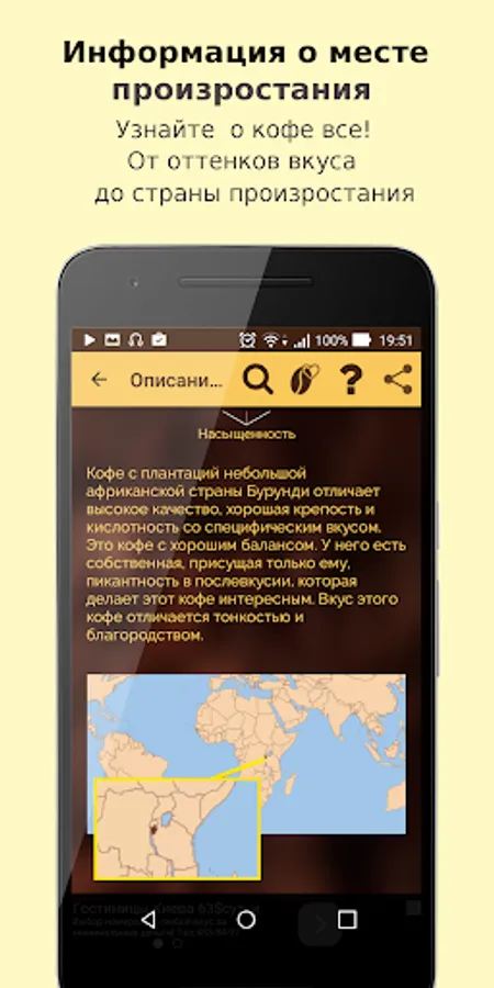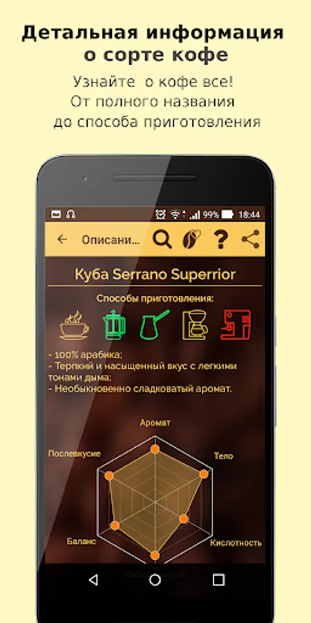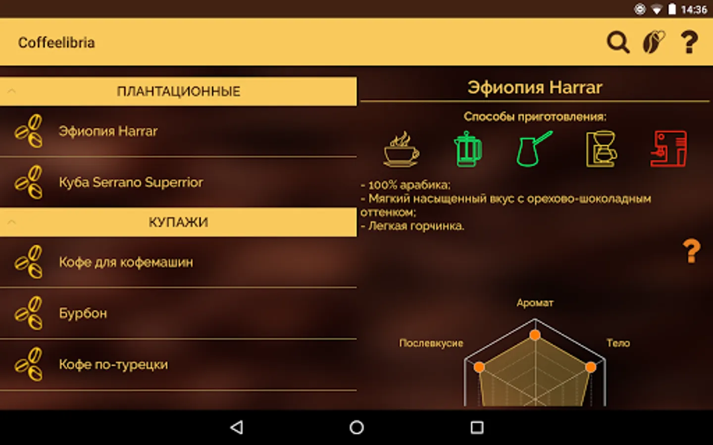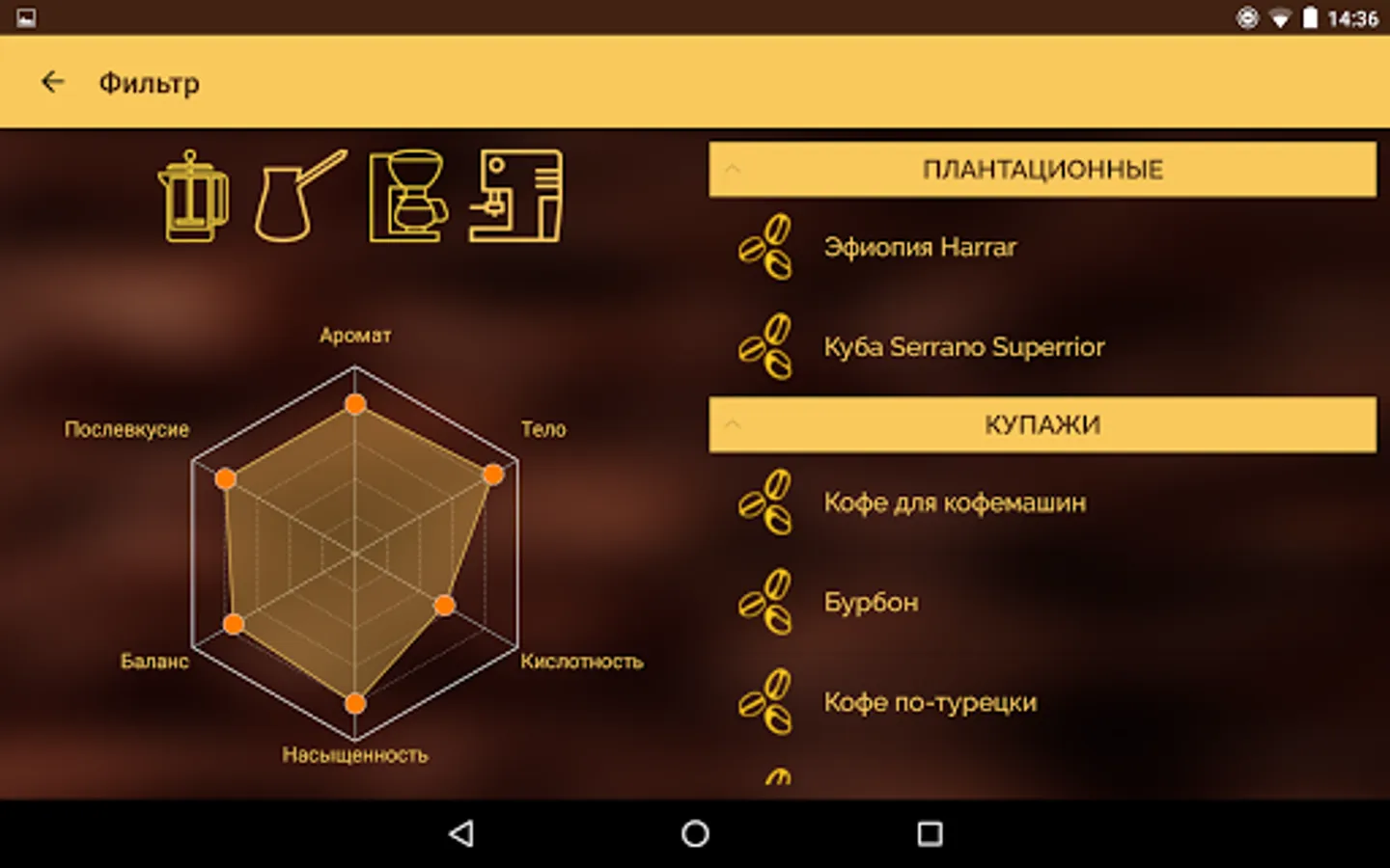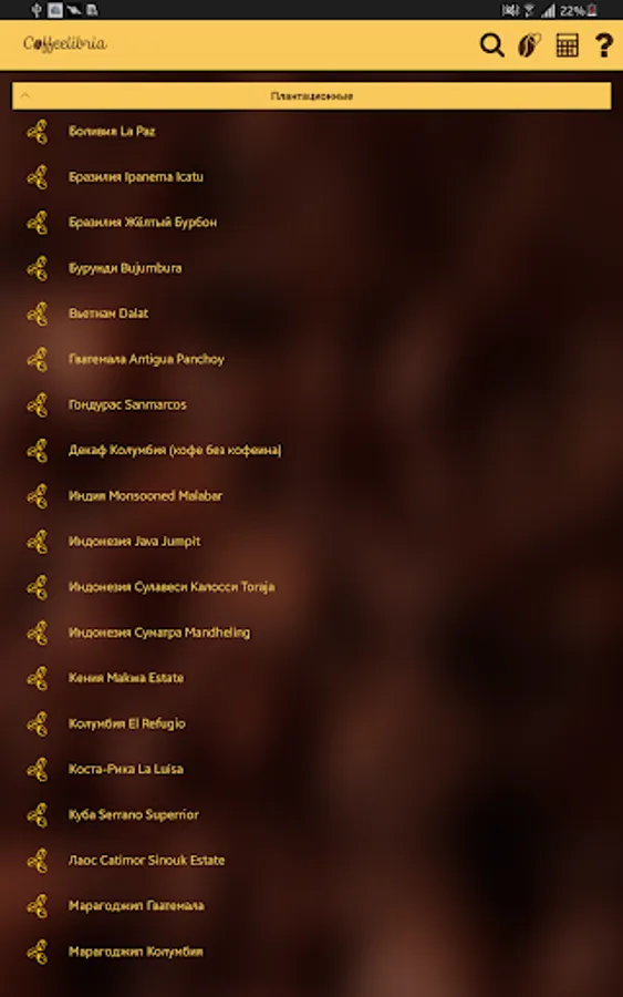 Especially for coffee gourmets and fans of flavored drink, we have developed a simple and handy application that will become an indispensable assistant and advisor in the choice of coffee.